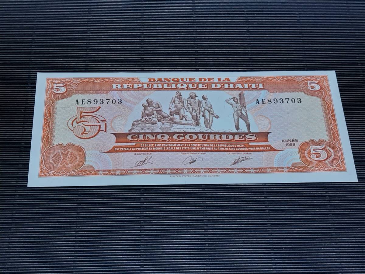 ハイチ 5 Gourde札  コレクション向きのピン札  1989年  未使用~甘い未使用    #AE893703