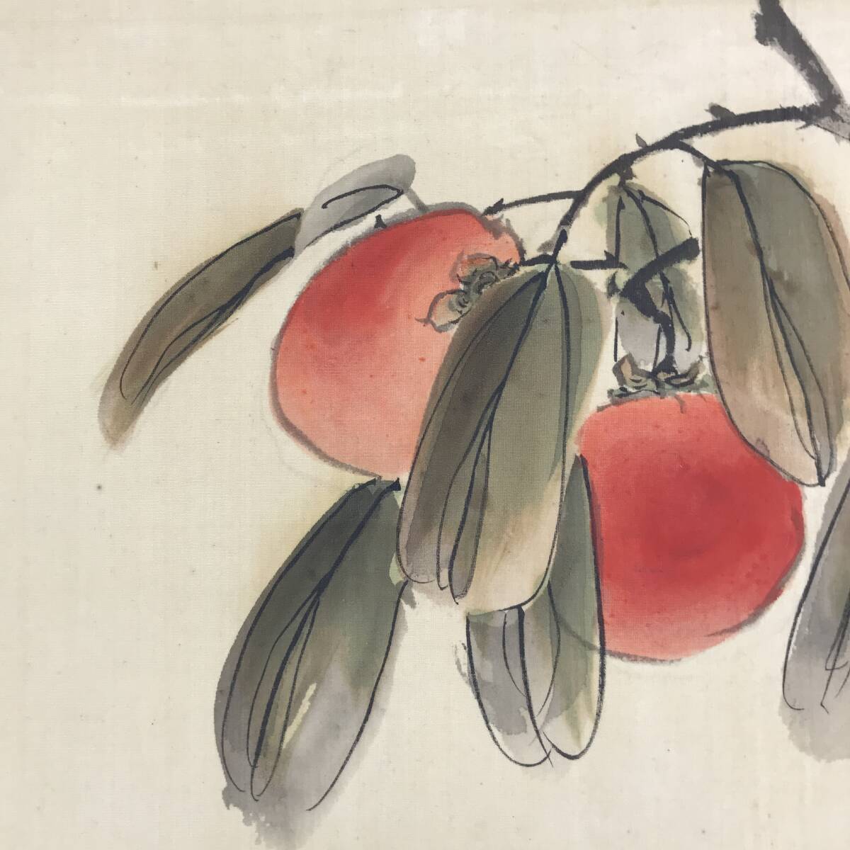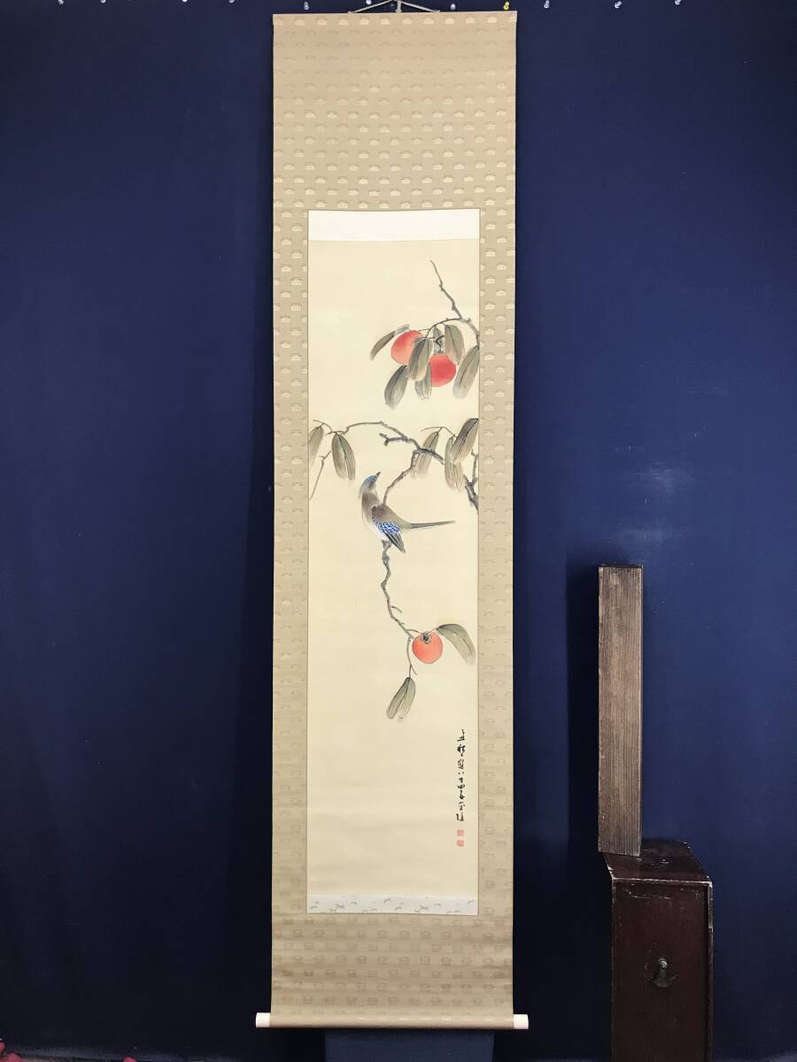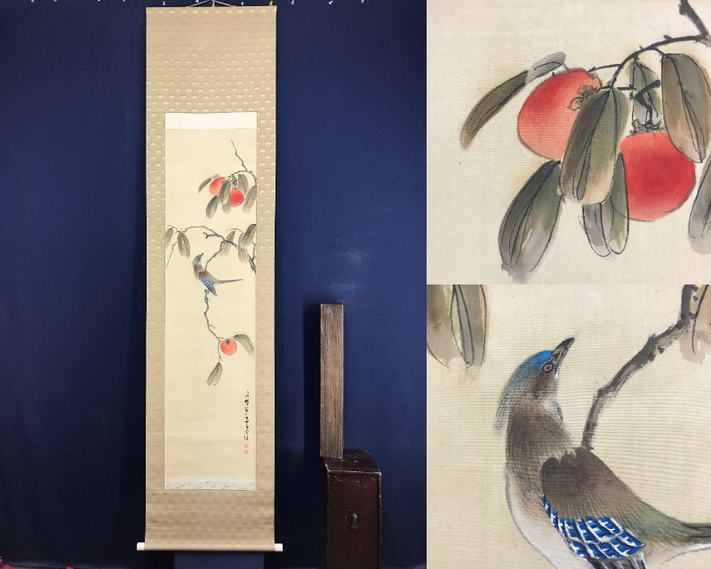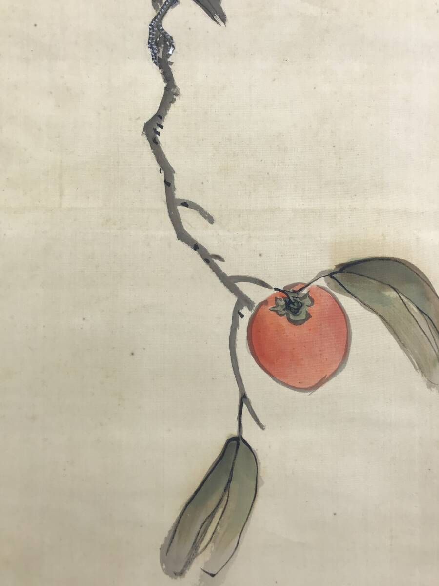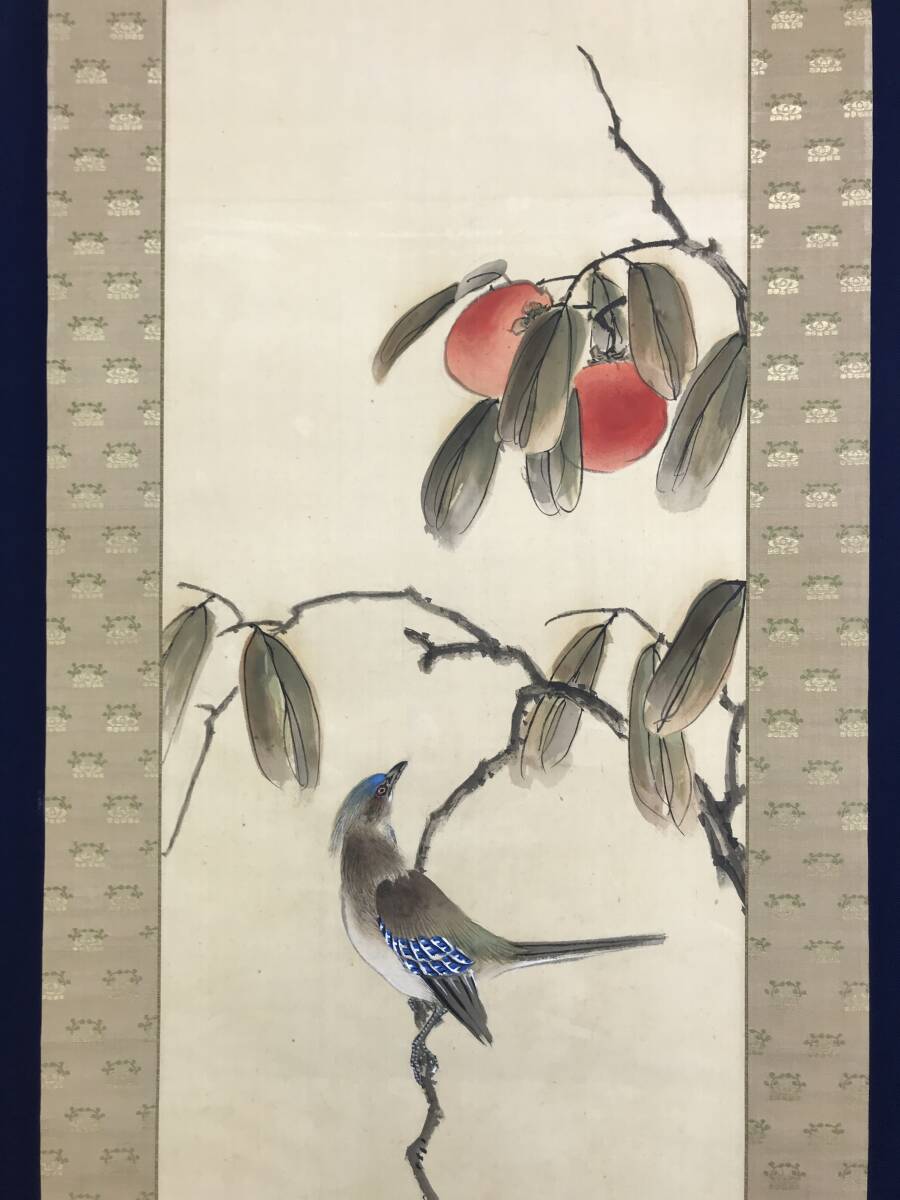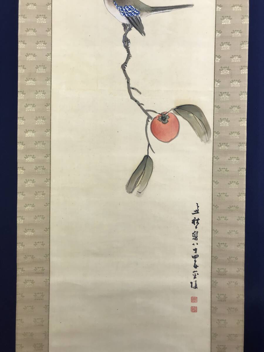 真作/石井金陵/柿に小禽図/柿の実小鳥/花鳥図/掛軸☆宝船☆AG-251