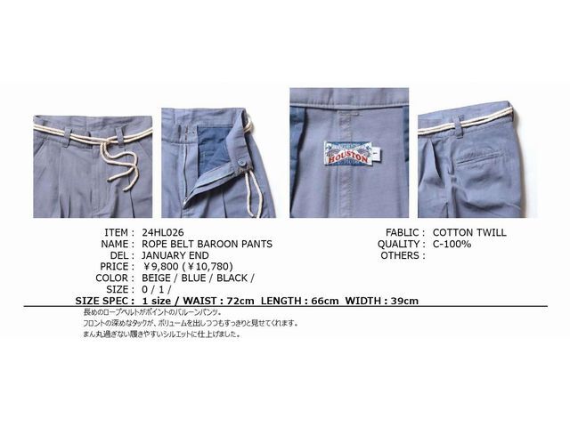 【送料無料 53%OFF】HOUSTON ヒューストン ウーマン ロープベルト バルーンパンツ NO.24HL026 BLUE_1サイズ(実寸71cm)