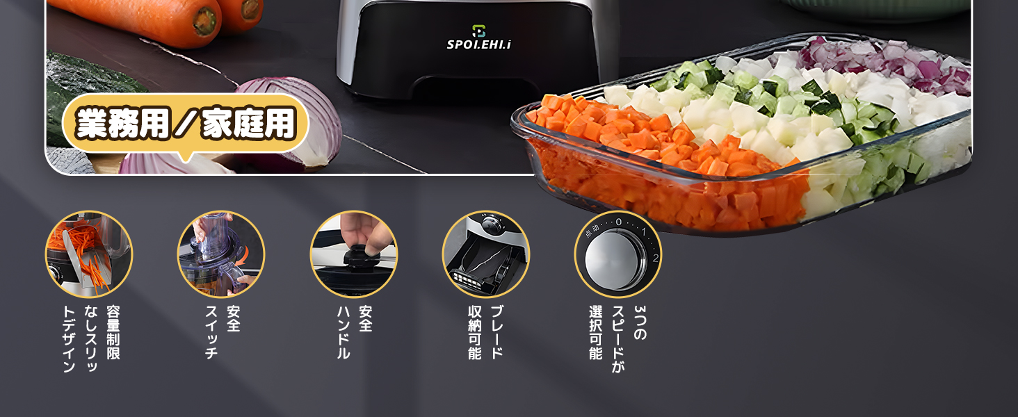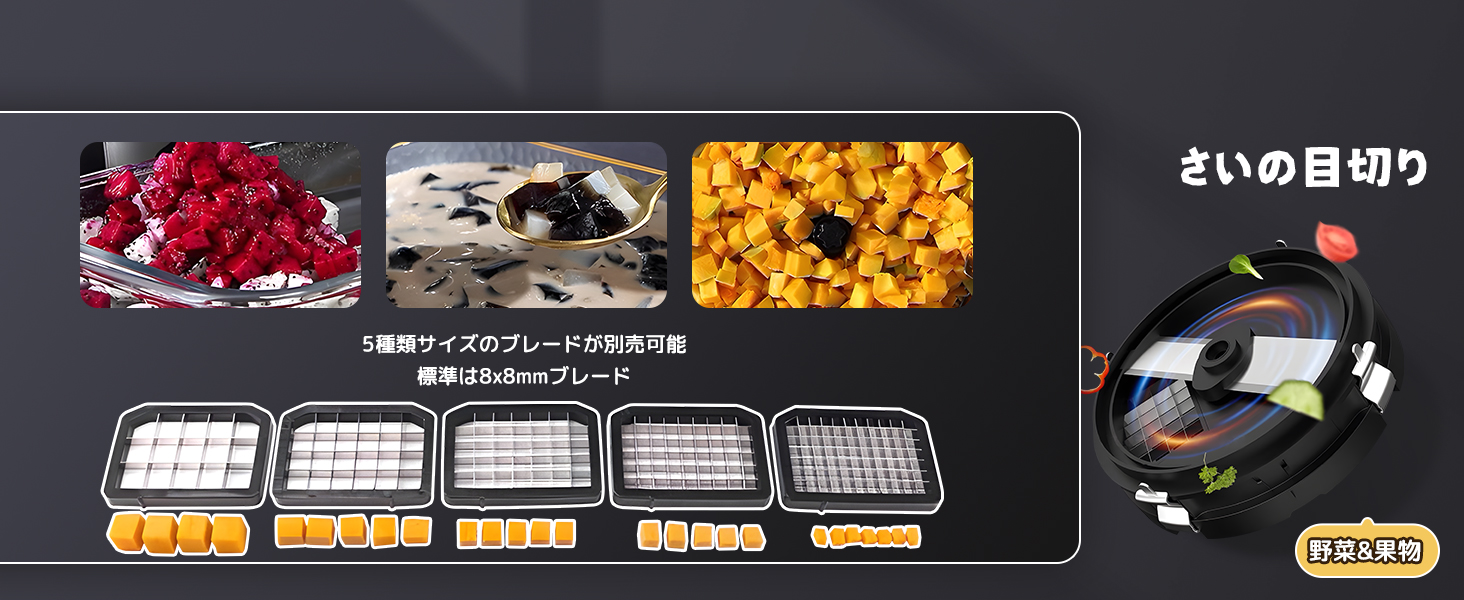【無駄なく】ニーズにより、7モデル選択可能ですので、無駄を省ぎます。8mmのさいの目切り、1.5-4mm厚さ調整可能のスライス、3x3mm厚さの千切り、1.5/2.5cm+2/3cm 二つのサイズ選択可能のみじん切り、肉に対応可能の細切れという5つのブレードが選択可能です。