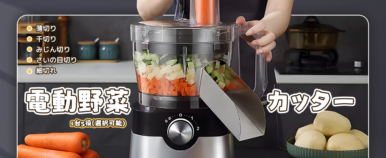 【効率化】2000ml容量 電動野菜スライサーはより効率を良く切る作業が完成できます。120kg/hのカット量、5分で1時間分の仕事が完了できます。料理が苦手で包丁使うのが遅い人たちにとってのヘルパーです!刃の付け替えも簡単で、短時間で様々なスタイルの食材を調理することができます。