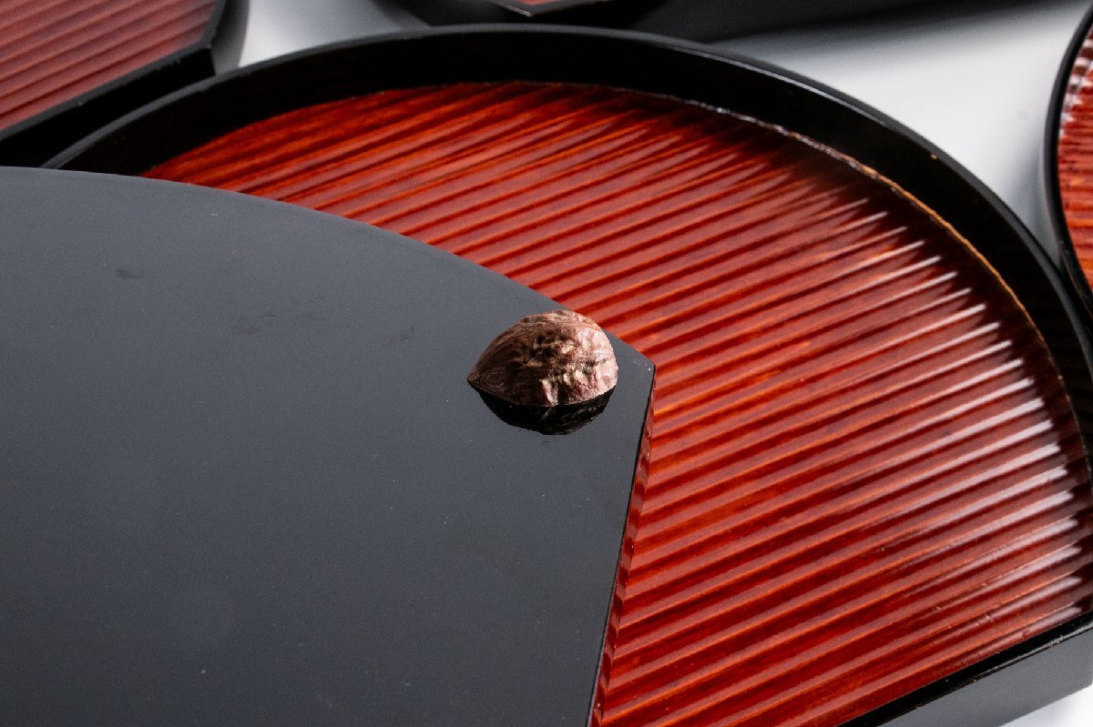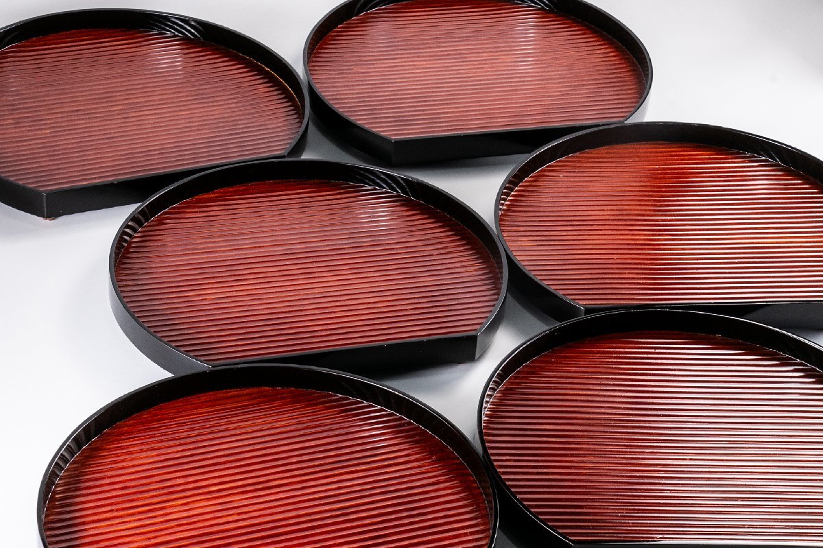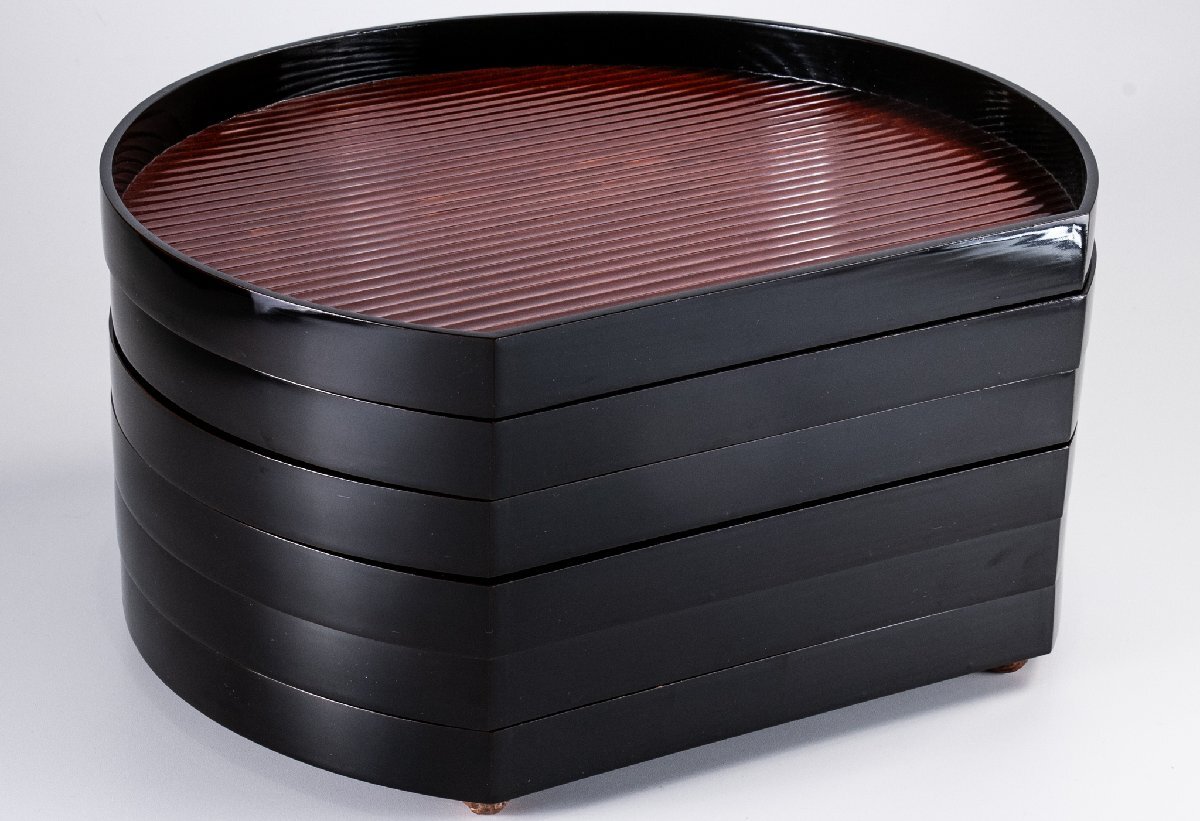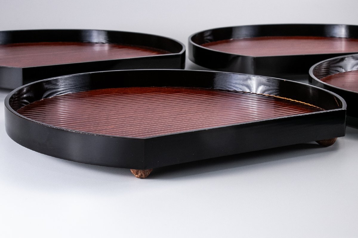 【うつわ】 時代物 春慶塗 胡桃足半月形 懐石膳 5客 D788 和食器 古美術 骨董 古玩 陶芸 漆芸 日本料理 懐石 料亭 茶道具