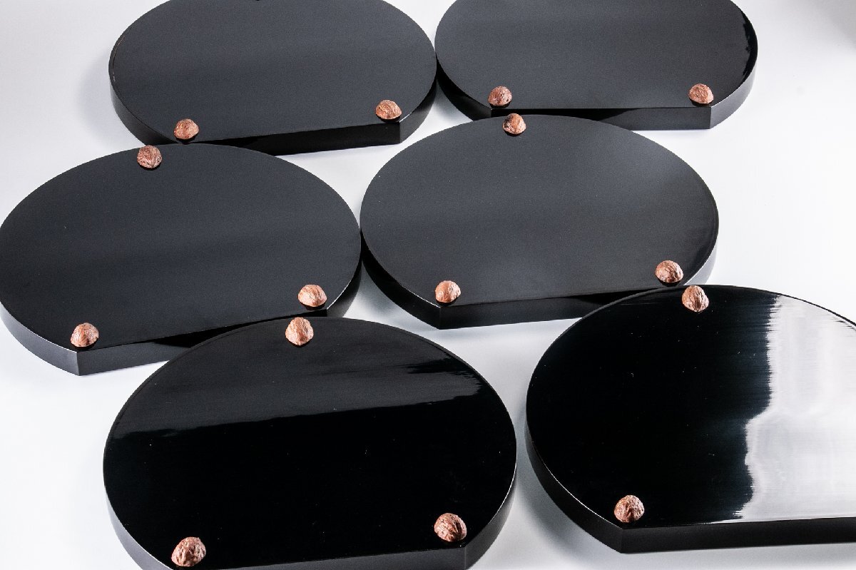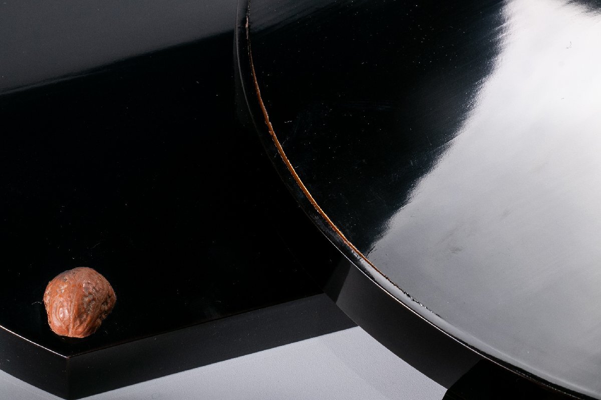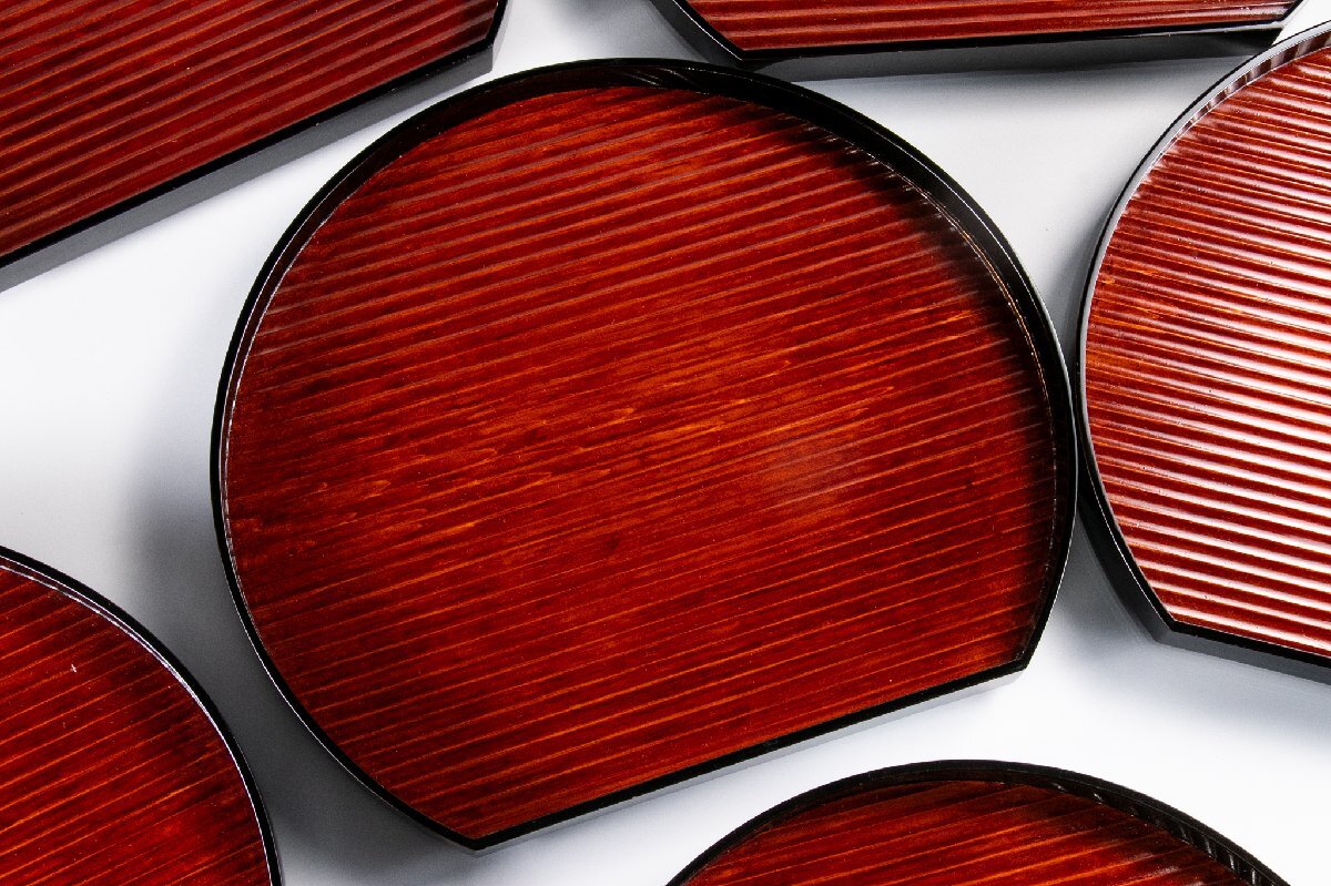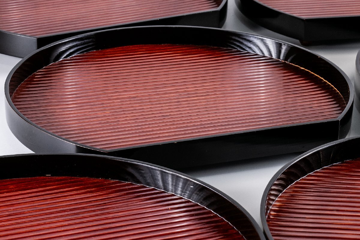 【うつわ】 時代物 春慶塗 胡桃足半月形 懐石膳 5客 D788 和食器 古美術 骨董 古玩 陶芸 漆芸 日本料理 懐石 料亭 茶道具