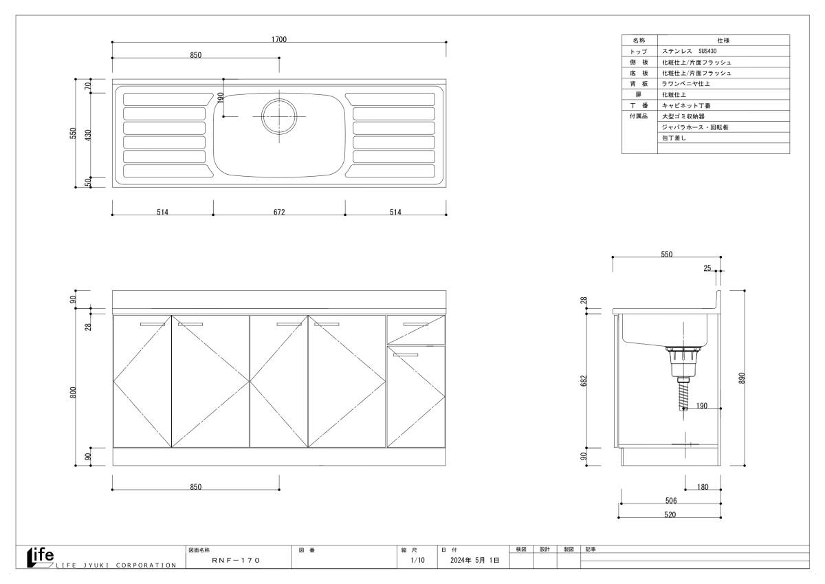 【ライフ住器】RNF-170 13色対応 流し台 1700×550 中水槽 【日本製】