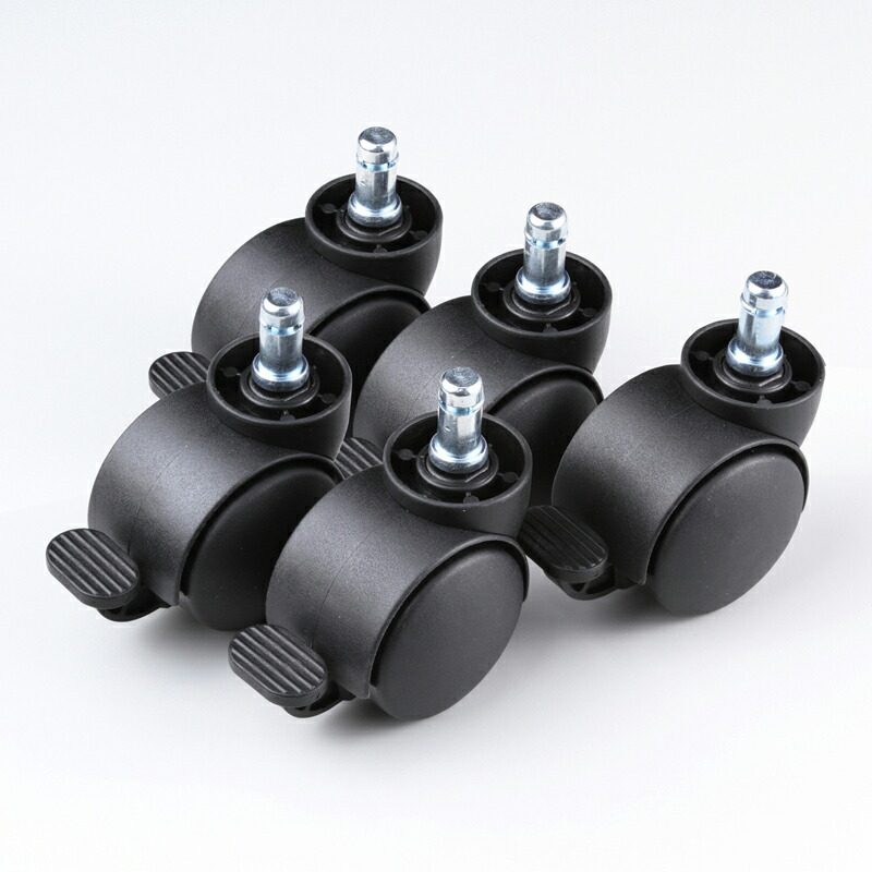チェアの転がりを防止する手動ストッパー付きキャスター。5個入り。