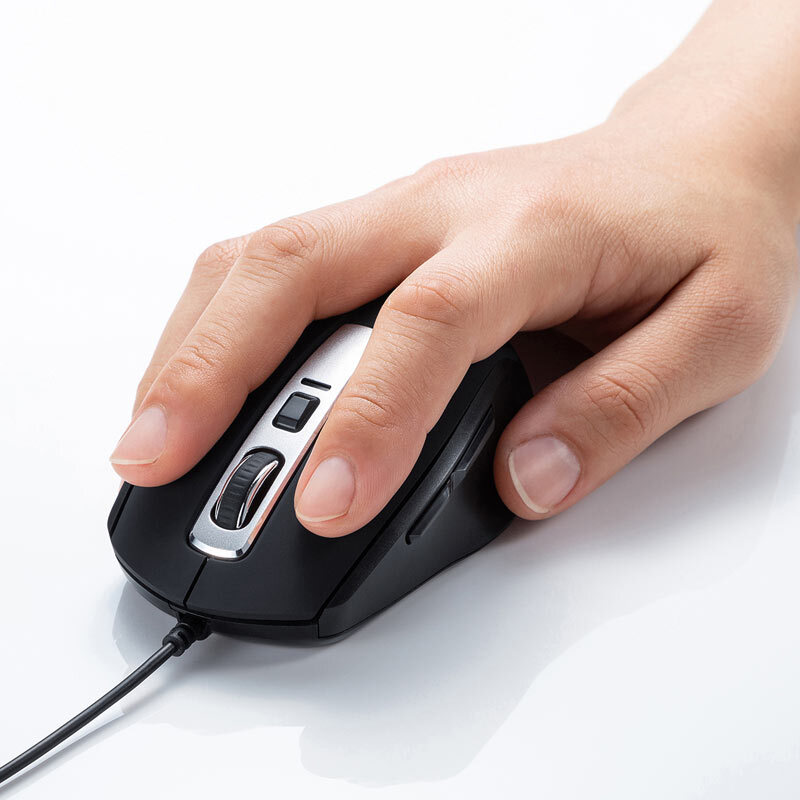 手に馴染む形状で、静音スイッチ採用の有線マウス。サイドボタン搭載で「戻る・進む」操作も可能。ブラック。