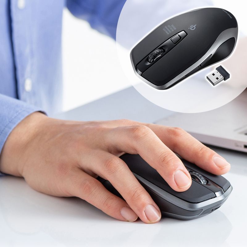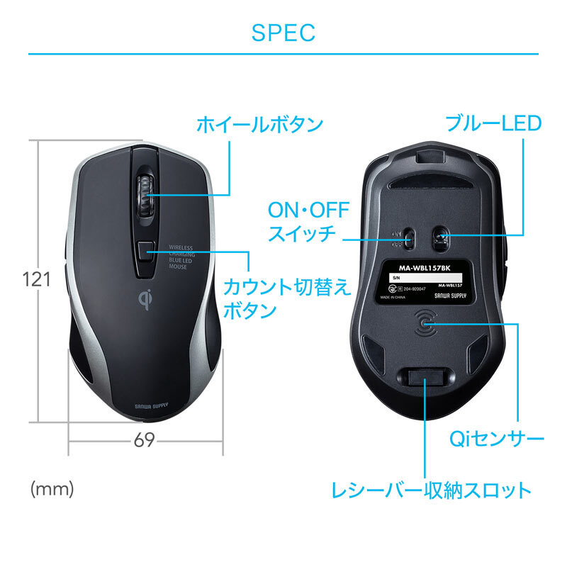●Qiと専用ケーブルで充電できる充電式ワイヤレスマウスです。