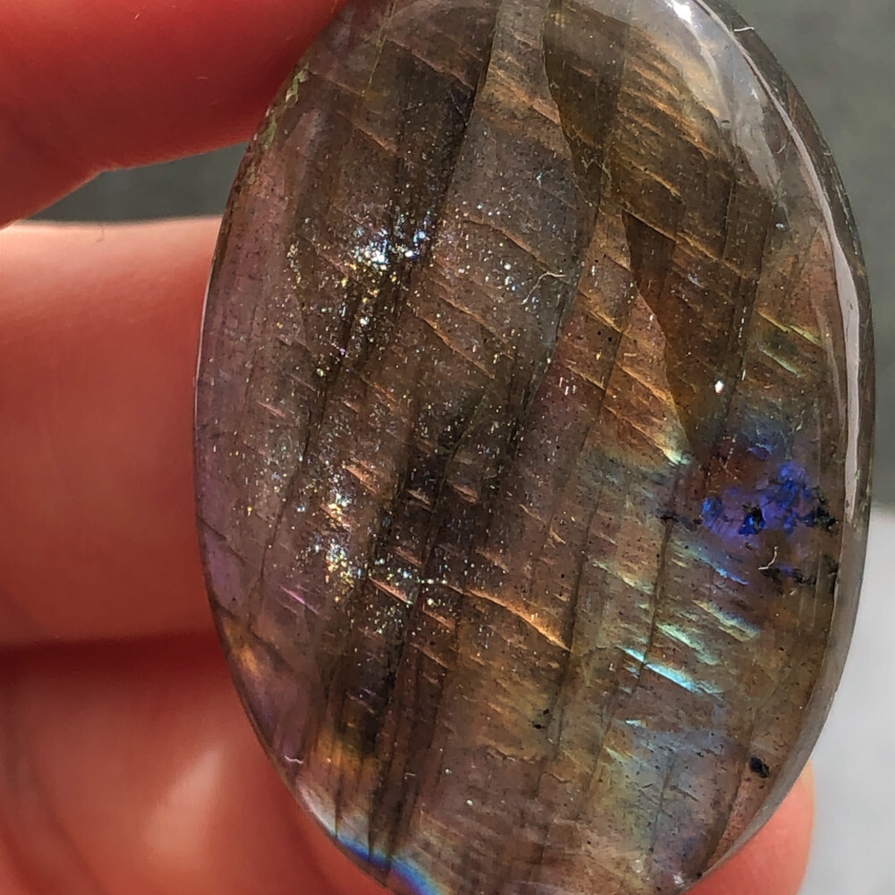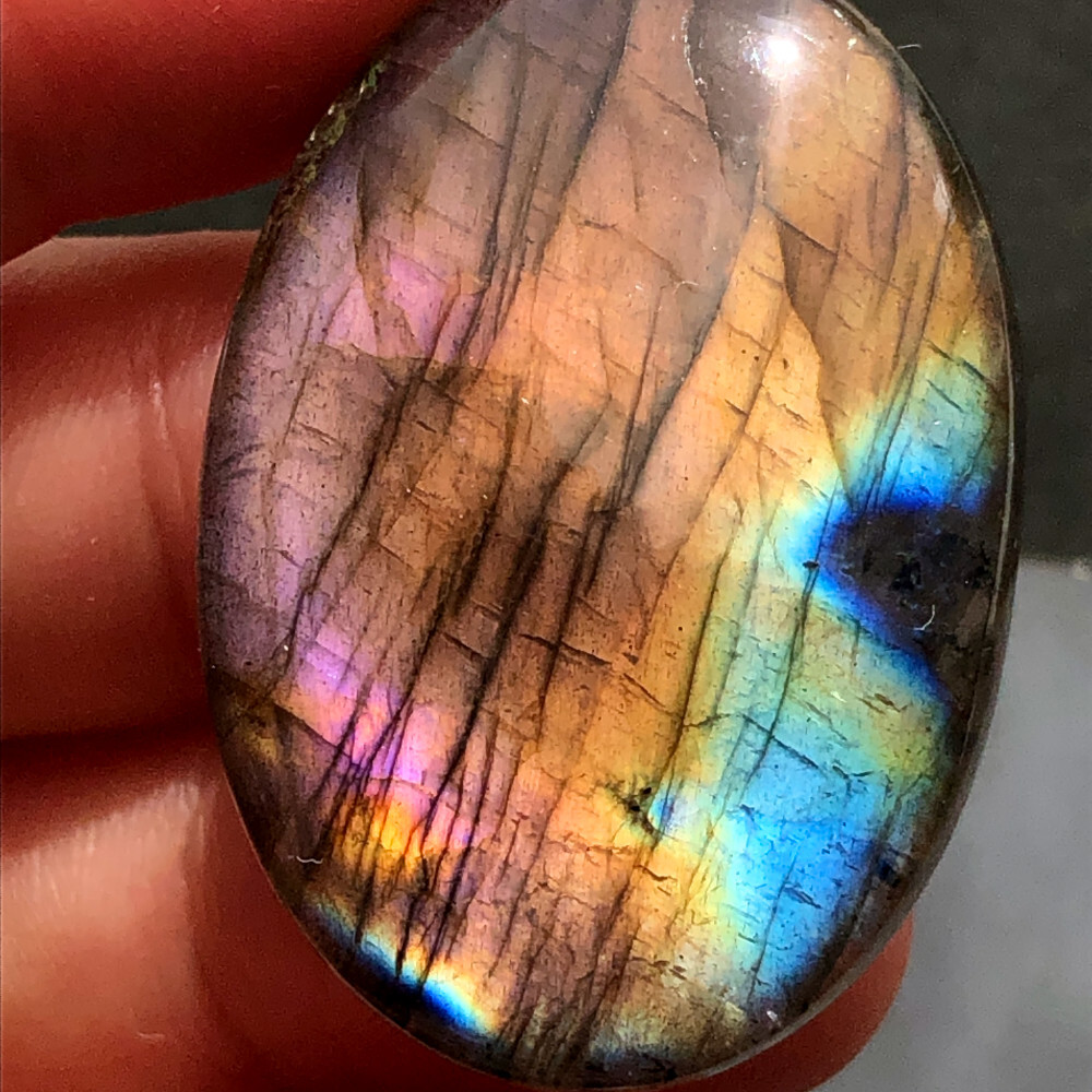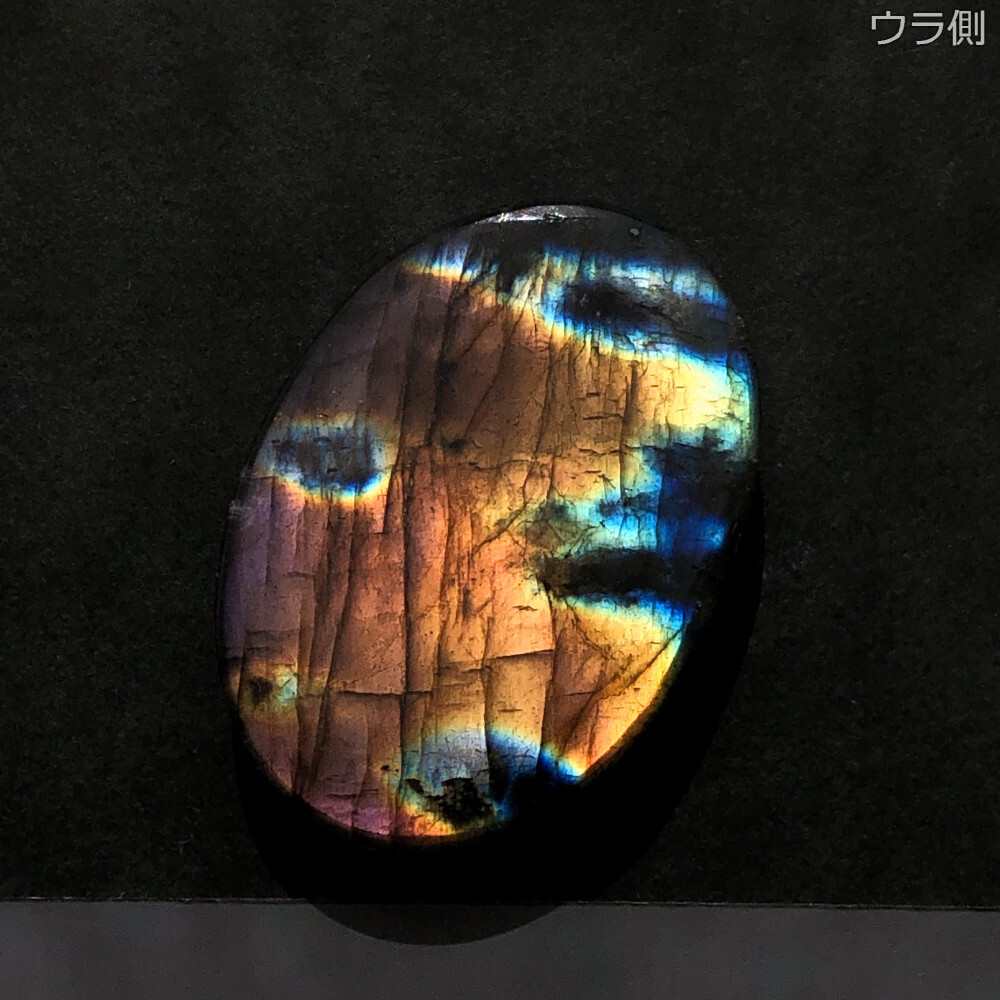 ピンク〜オレンジ〜黄〜青のマルチカラーの輝きがとても美しい、ラブラドライトの楕円形ルースです。
