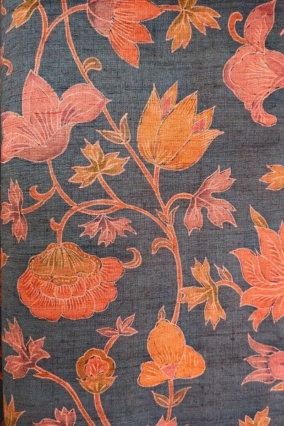柔らかなグレーの紬地に、赤系の唐花が描かれた紬の小紋です。 粋な色合いがとてもお洒落な一枚です。 |