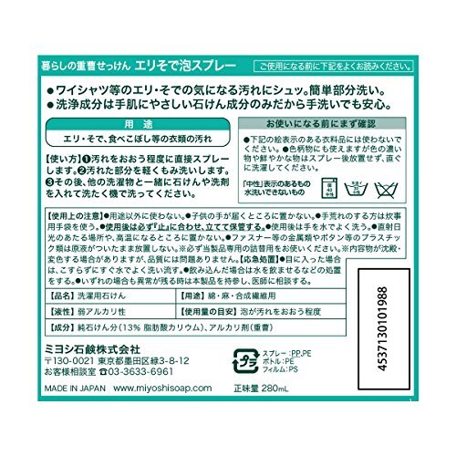「【セット品】ミヨシ 暮らしの重曹せっけん エリそで泡スプレー 本体280ml + 詰替用230ml×2個」▼4904740616896▼(商品説明)本体280ml + 詰替230ml×2・nan 3個アソート ・・Size:3個アソート・商品サイズ (幅×奥行×高さ) :120mm×174mm×185mm・原産国:日本・内容量:本体280ml + 詰替用230ml×2個説明 商品紹介 ●用途以外に使わない。 ●子供の手が届くところに置かない。 ●手荒れのする方は炊事用手袋を使う。 ●使用後は必ず「止」に合わせ、立てて保管する。 ●使用後は手を水でよく洗う。 ●直射日光のあたる場所や、高温になるところに置かない。 ●ファスナー等の金属類やボタン等のプラスチック類は原液がついたまま放置しない。 ※必ず当製品専用の詰替用をお使いください。 ※内容物が沈殿・変色する場合がありますが、品質に問題ありません。 【応急処置】 ●目入った場合は、こすらずにすぐ水でよく洗い流す。 ●飲み込んだ場合は水を飲ませなどの処置をする。 ●いずれの場合も異常が残る時は本製品を持参し、医師に相談する。 主成分は天然素材生まれの石けんと重曹だから、手で洗っても肌におだやか。 色柄物や生成りの物にも安心してお使いいただけます。 緑茶のほのかな香り付でお洗たく時間も爽やかに。・原材料・成分 純石けん分(13% 脂肪酸カリウム)、アルカリ剤(重曹)