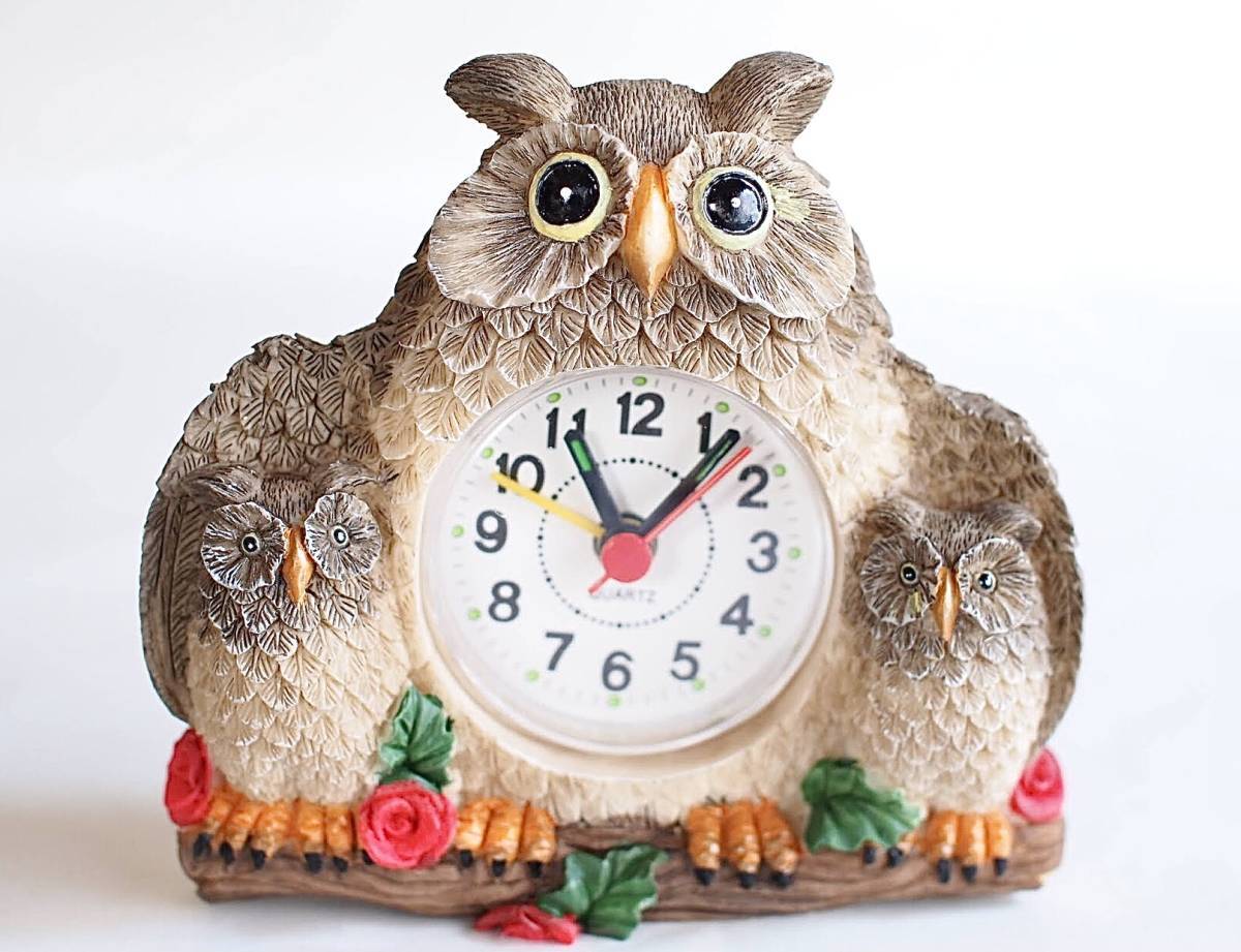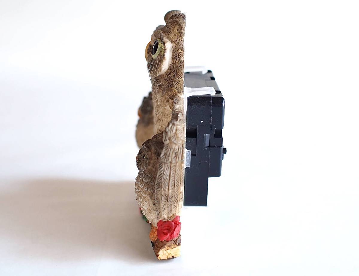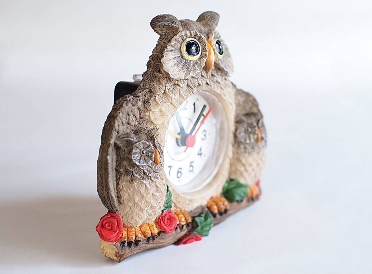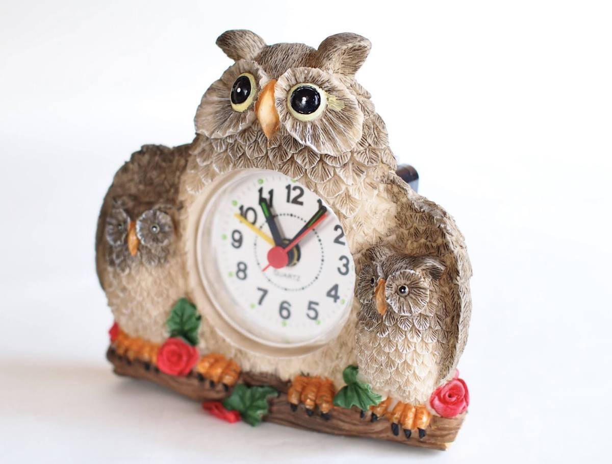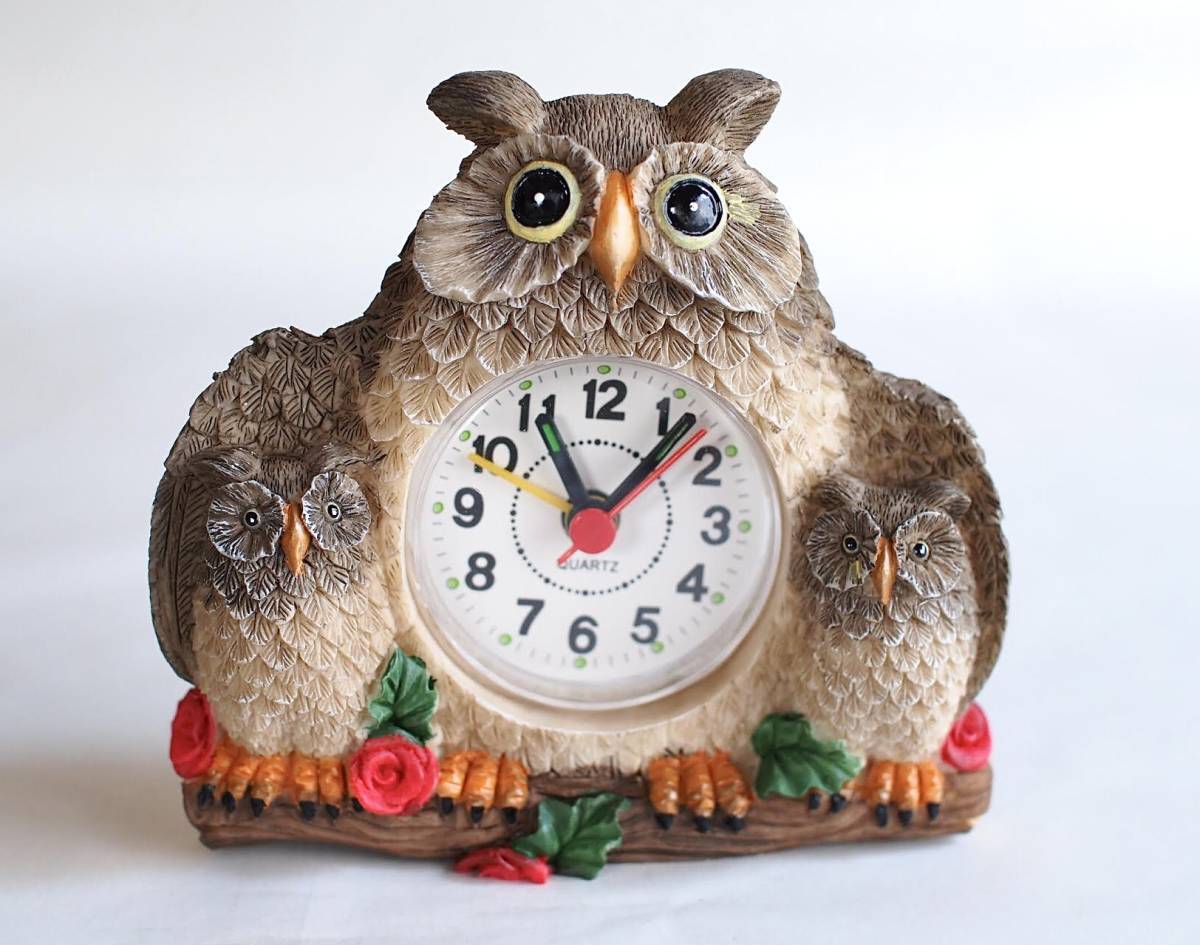 【Z-28】ふくろう親子のかわいい置き時計/バラ/薔薇/花/クオーツ/目覚まし/単3電池1本/中古/梟/昭和レトロ/ラッキーアイテム/インテリア