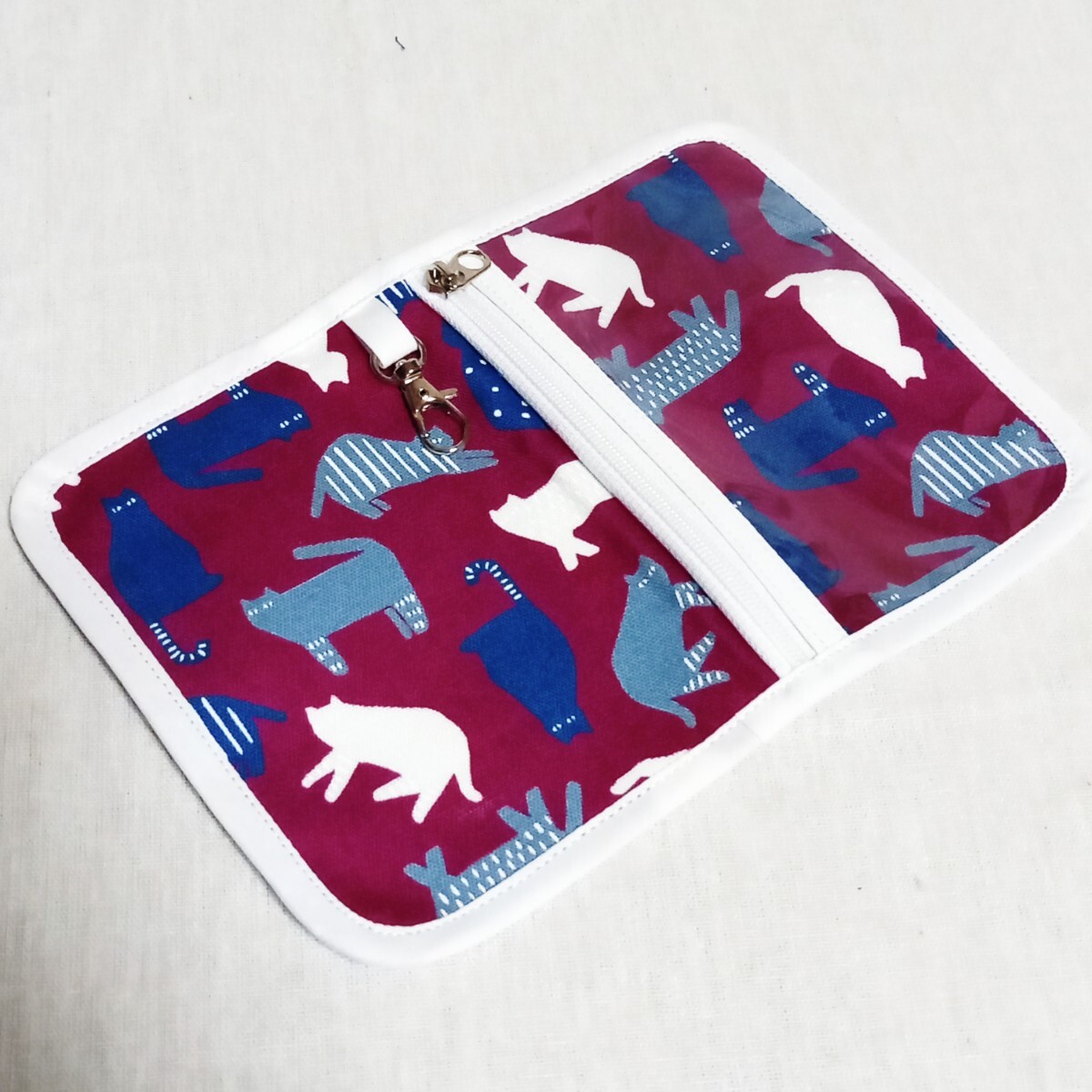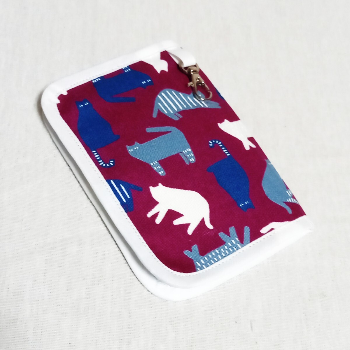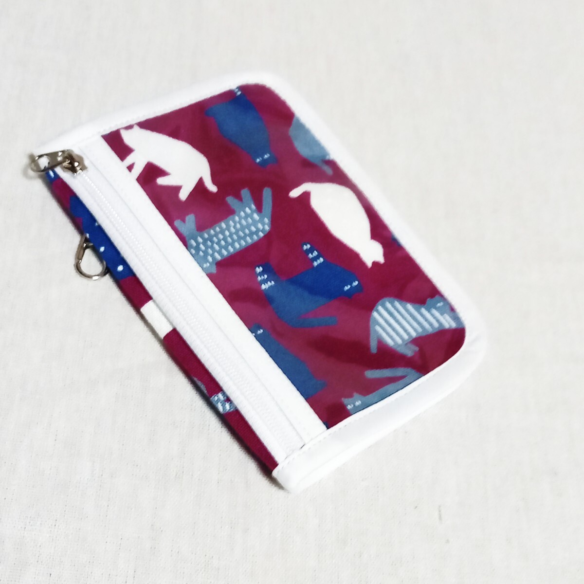 メイン生地はエンジ地に青&水色&白カラーのねこちゃんが可愛い生地