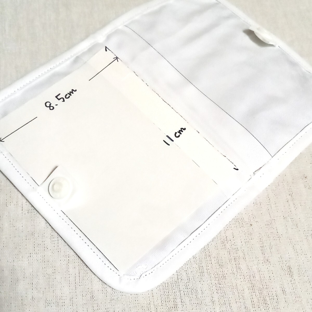 療育手帳や障がい者手帳の【横8.5×縦11cm】ぐらいものが入れられる【縦14×横10(開いて22cmぐらい)】に設定致しました。