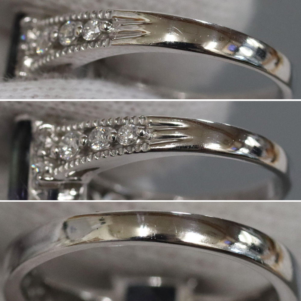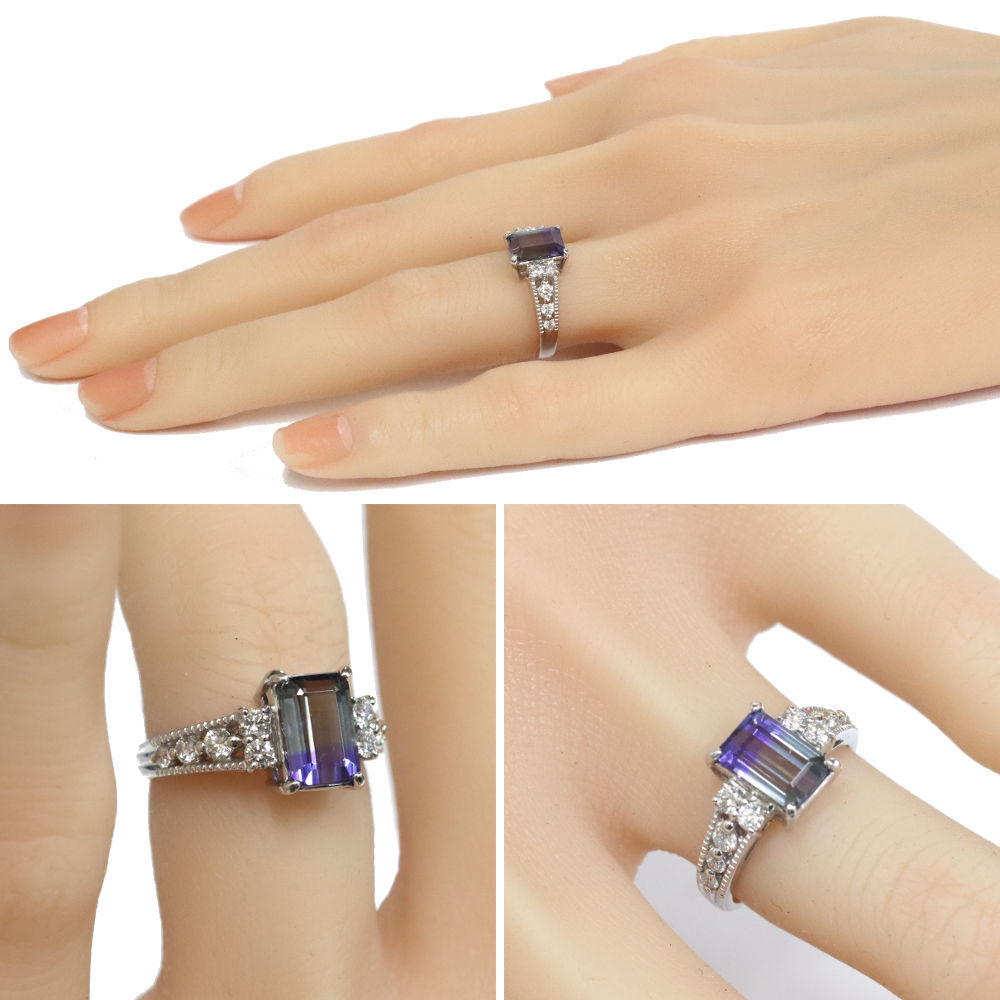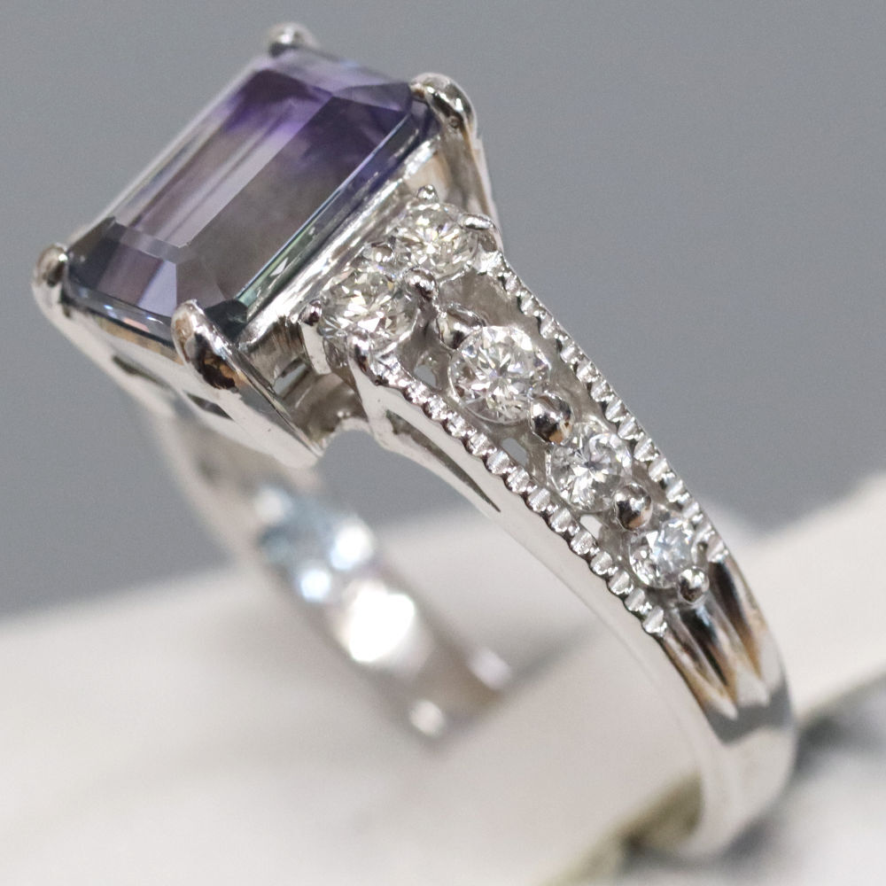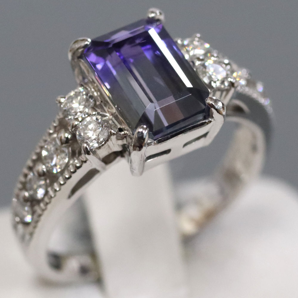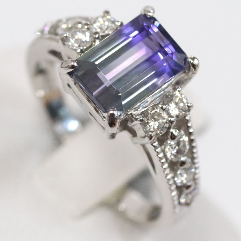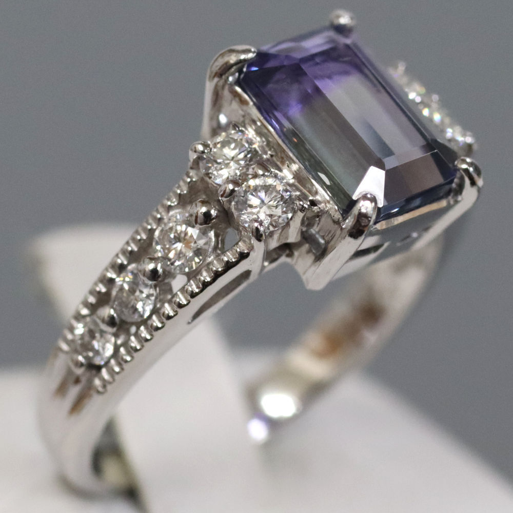 | Pt900バイカラーゾイサイトダイヤモンドリングの中古品です。 鑑別書が付属します。 お色味は青味がかった紫と、緑がかったグレーのバイカラーです。 肉眼では見えませんが、お石に小さな欠けがあります。 ダイヤモンドは、インクルージョンはありますが、輝きがあります。 プラチナに小傷があります。