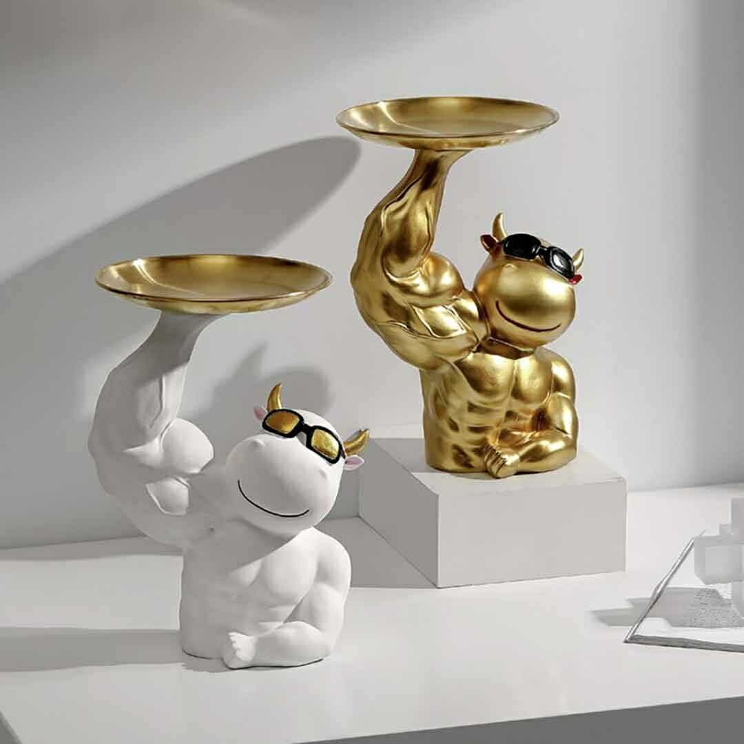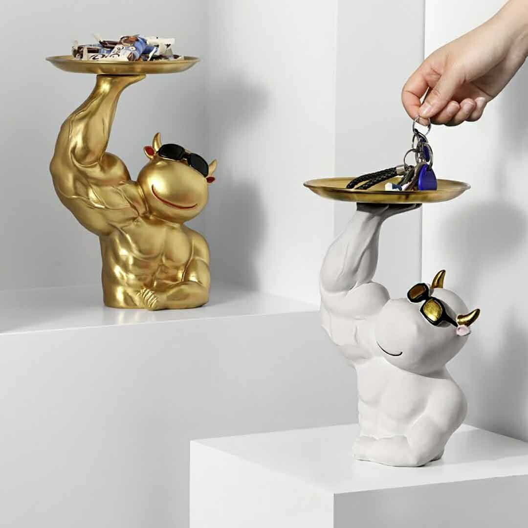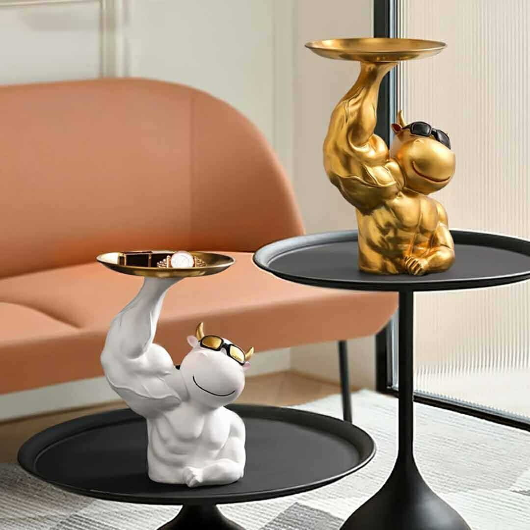 見る者みんなに笑顔を運んでくれるサイドテーブルです。マッスルな牛を模したミニテーブルで、その場の雰囲気を明るくしてくれます。愛嬌のある姿は単なる牛の置物ではなく、逞しい腕でしっかりと飼い主の身の回りのものを受け止めてくれます