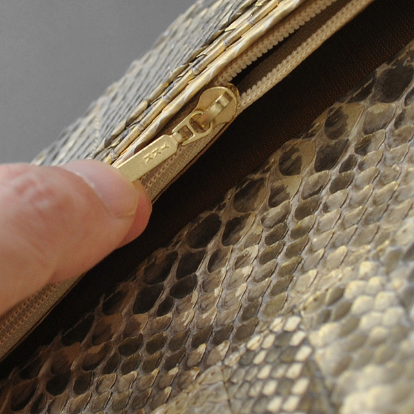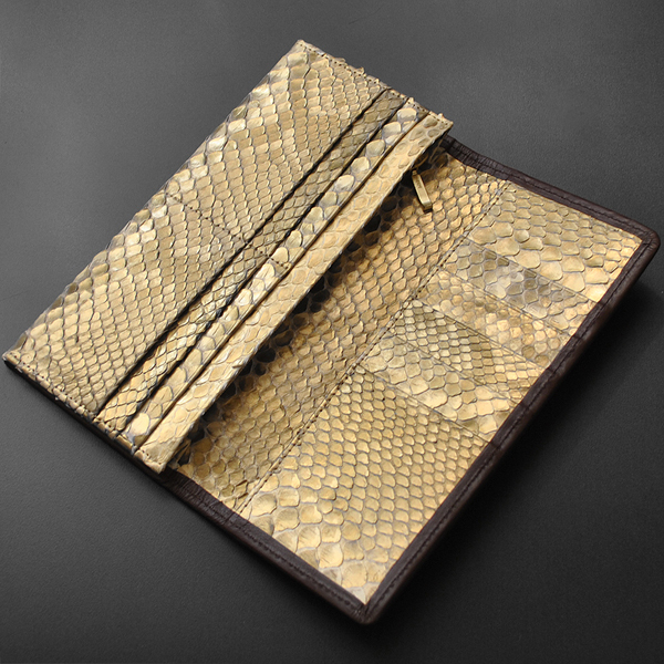 錦ヘビ特有の柄を生かし、その上に薄金加工を施しましたので、シック&ゴージャスな長財布になりました。