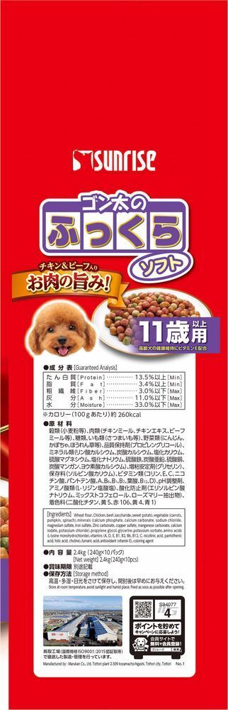 穀類(小麦粉等)、肉類(チキンミール、チキンエキス、ビーフミール等)、糖類、いも類(さつまいも等)、野菜類(にんじん、かぼちゃ、ほうれん等)、品質保持剤(プロピレングリコール)、ミネラル類(リン酸カルシウム、炭酸カルシウム、塩化カリウム、硫酸マグネシウム、塩化ナトリウム、硫酸鉄、炭酸亜鉛、硫酸銅、炭酸マンガン、ヨウ素酸カルシウム)、増粘安定剤(グリセリン)、保存料(ソルビン酸カリウム)、ビタミン類(コリン、E、C、ニコチン酸、パントテン酸、A、B6、B1、B2、葉酸、B12、D)、pH調整剤、アミノ酸類(L‐リジン塩酸塩)、酸化防止剤(エリソルビン酸ナトリウム、ミックストコフェロール、ローズマリー抽出物)、着色料(二酸化チタン、黄5、赤106、黄4、青1)