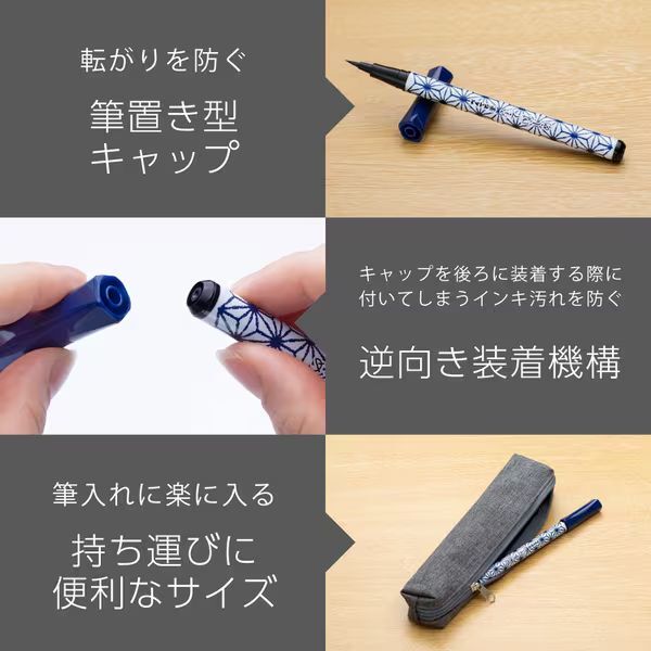 ・小回りが利く、毛筆(もうひつ)初心者用の筆ペンです。 穂先にインキを浸透させたり、インキの量を調整したりする手間がなく、開封後キャップを外したらすぐに書き始められます