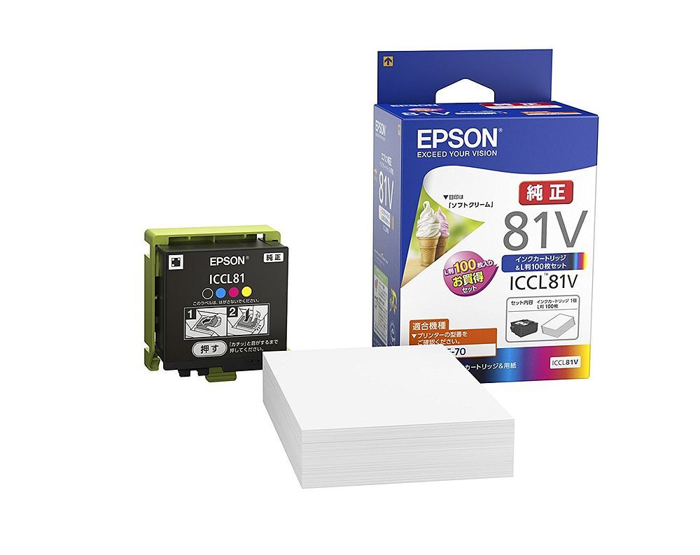 ICLC81+写真用紙L版100枚セットモデル。セット用紙は写真用紙ライト<薄手光沢>です。対応機種:PF-70(2014/9現在)PF-70 用インクカートリッジ(純正)