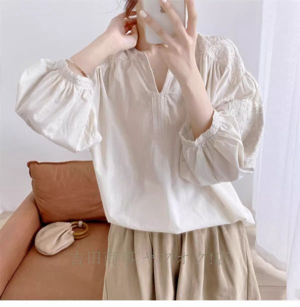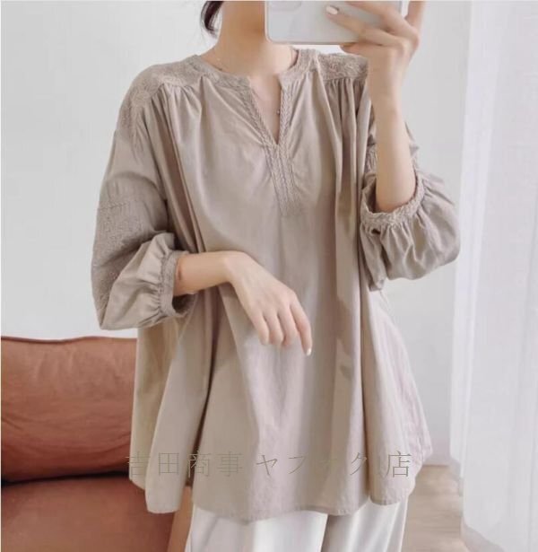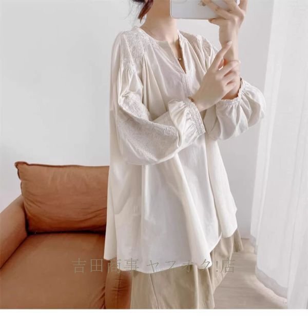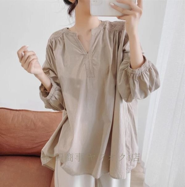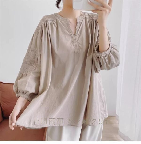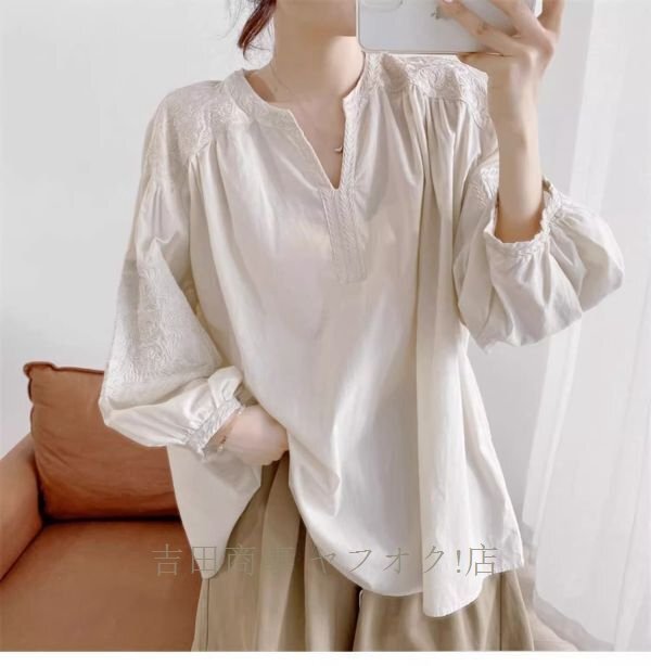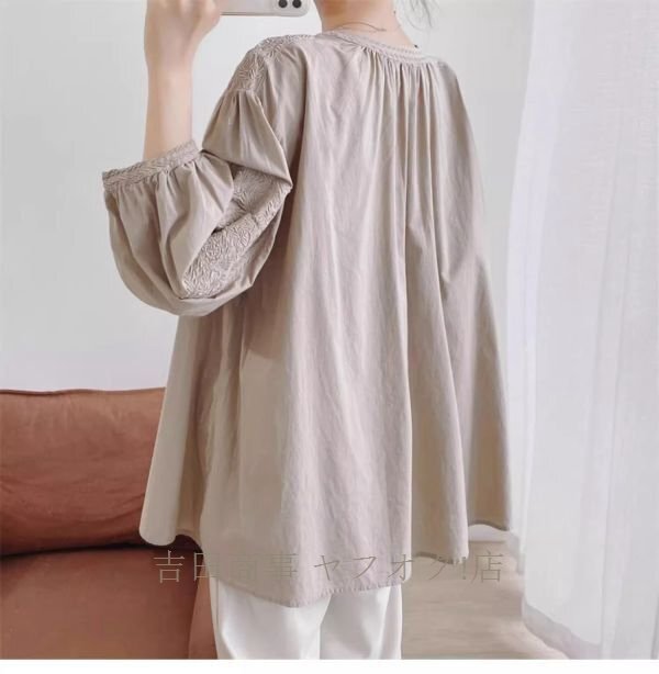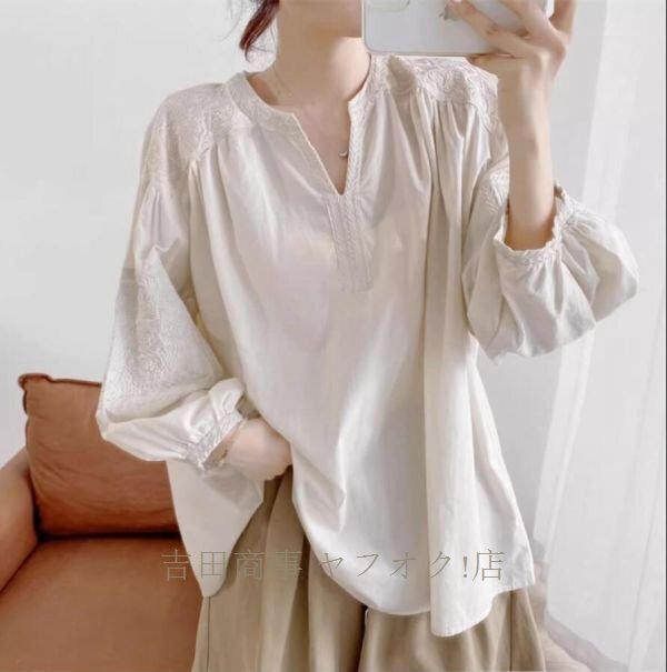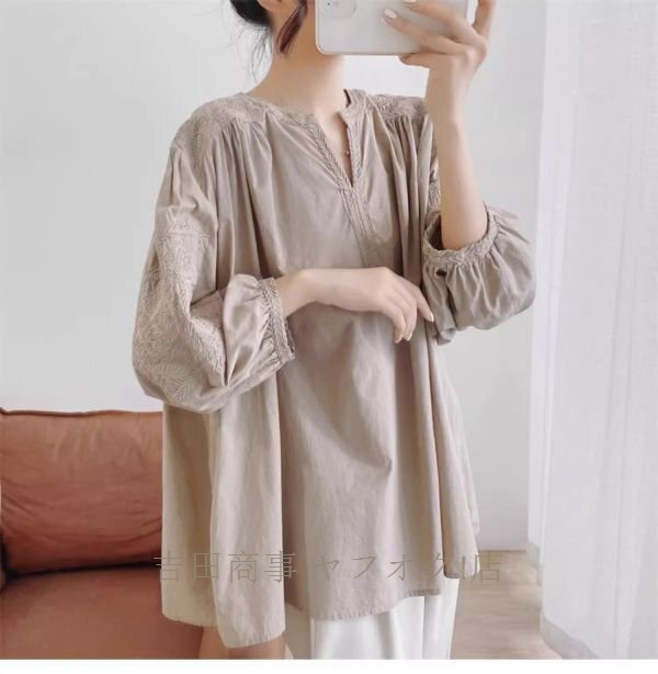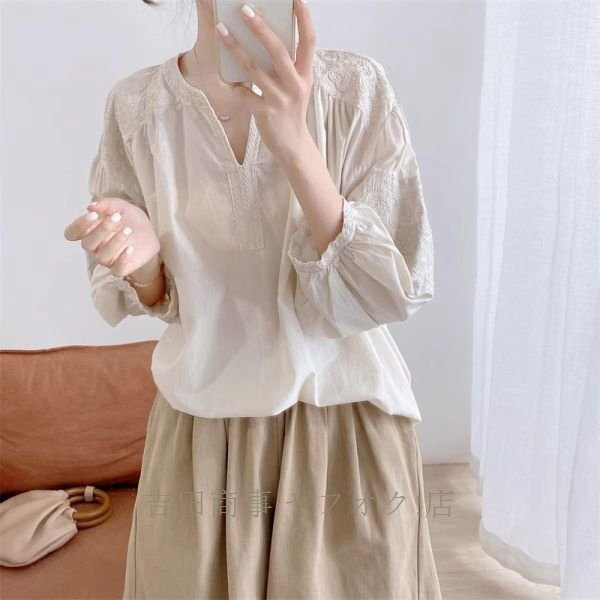 A0962☆新品カジュアル コットン チュニック 刺繍り 長袖 ブラウス 30代 40代 50代 通勤 OL 素敵な オシャレ トップス 杏
