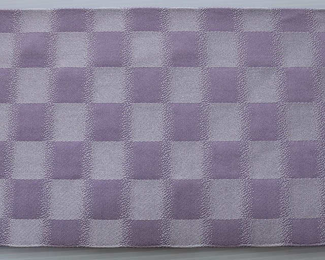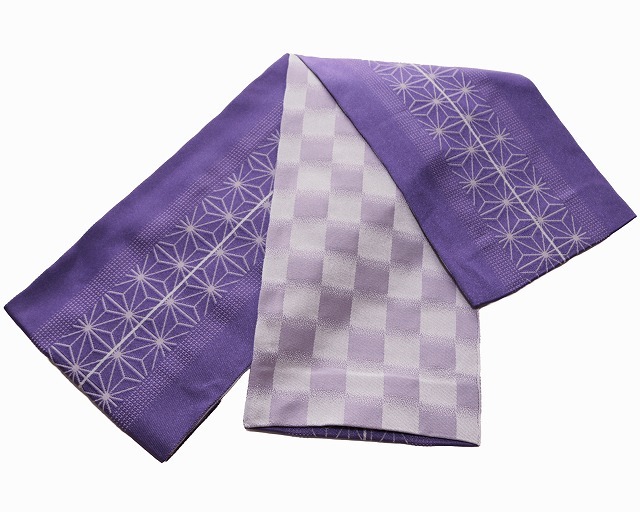 K2342-01 河句留 おしゃれな色と柄の浴衣帯です。 浴衣帯となっておりますが ポリエステル素材の帯ですのでおしゃれ着用に おけい古事用着物に お手入れができますので(表示参考)気軽に変わり帯などで帯姿を楽しんでみてはいかがでしょうか。 在庫あるのみとなっておりますので お目にとまりましたらお早目に!お色は、紫色地に麻の葉柄や線柄があり、反対側は藤色系色にて市松模様となっています。★ | ||||