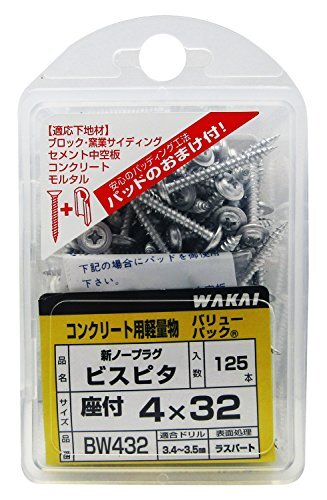 「WAKAI ビスピタ 座付頭 4x32mm ねじ部31mm 約125本入」▼4903768472507▼(商品説明)・ 4×32mm BW432・・Size:4×32mm・用途:コンクリート用・パック形状:ポリプロピレン製パッケージ(バリューパック)・下穴ドリル径:3.4~3.5mmビスピタ約125本入りです