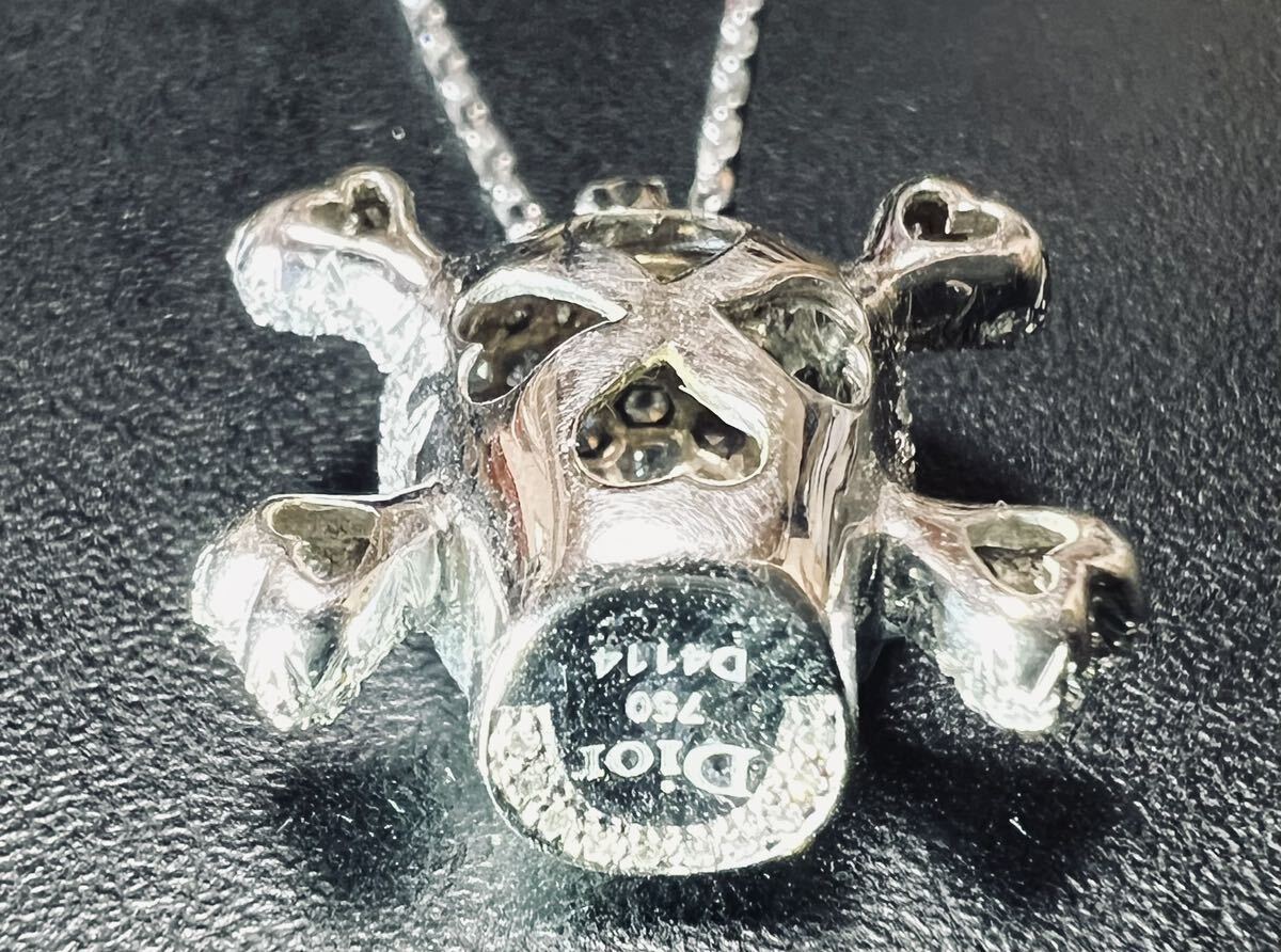 ペンダントトップの下側やペンダントトップのループ(バチカン)の部分にもダイヤモンドが埋め込まれており、ペンダントトップを下から撮影した画像の通りにも写っている通り「Diorの刻印と18金ホワイトゴールド製を示す750の刻印とシリアルナンバーの刻印」が刻まれています。