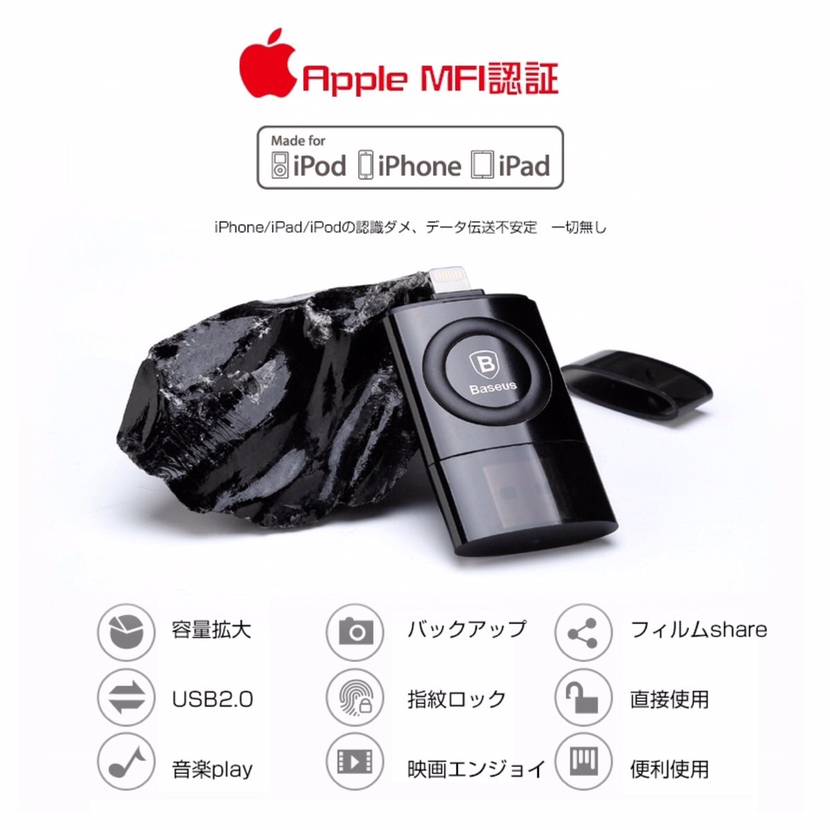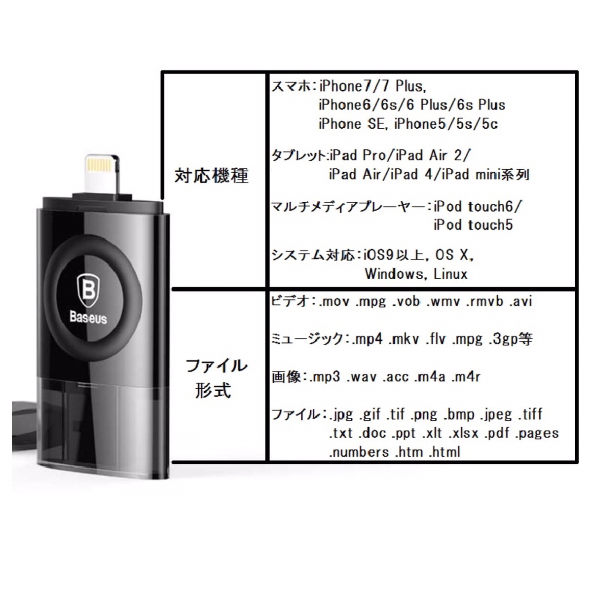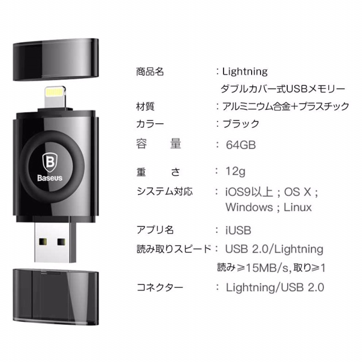 ご覧頂きありがとうございます。 64GBのiPhoneメモリーです。 ■コンパクトで持ち運び便利ですのでiPhoneと一緒にポケットに入れて持ち運び等できます。 ■ムービー、写真、音楽など様々な形式のデーターに対応しております。 カラー:ジェットブラック 商品状態:新品・未使用 規格:MFI認証ライトニングUSBメモリ 容量:64GB インターネット社会で、クラウド保存できる時代ですが、万が一の天災等でネット環境が使えなくなった時、データ保存はやっておいて損はありません。 購入を検討されているお客様、すでに購入されたお客様へのお知らせ・お願い *ぎりぎりのお値段で提供している為、送料を安くする為箱なしの製品となります。製品は新品ですので、ご安心ください。 *日本語の説明書付属しております。 *iPhoneにてご利用の際は、専用アプリのダウンロードが必要となります。 *ご利用の際は説明書をご覧下さい。 ご購入された商品はすべて検品してから発送致します。 お客様都合による返品・返金対応は致しませんのでご了承ください。 お届けの際に汚れ・破損等ございましたら、対応させていただきますのでお気軽にご相談ください。※必ず評価前にご相談ください。 誠心誠意を込めて対応させて頂きます。 ※こちらはベセス正規代理店になります。 #USBメモリー #アイホン #アイフォン #iPhone #USB 64GB バックアップ #携帯 #PC #ノートパソコン #アップル #パソコン #PCノートパソコン