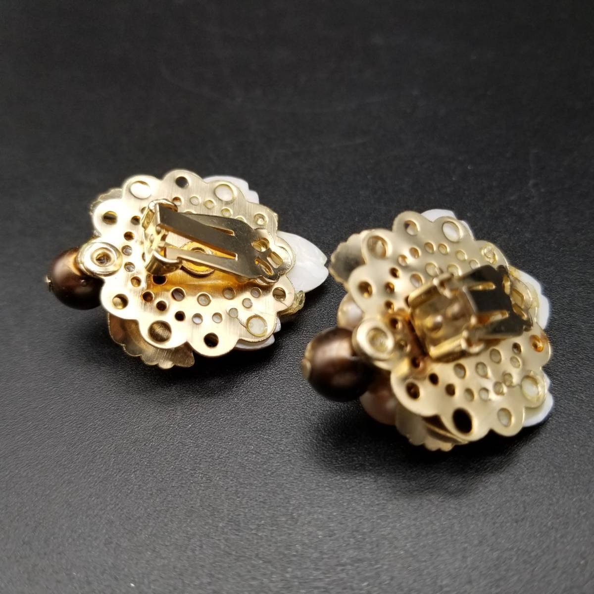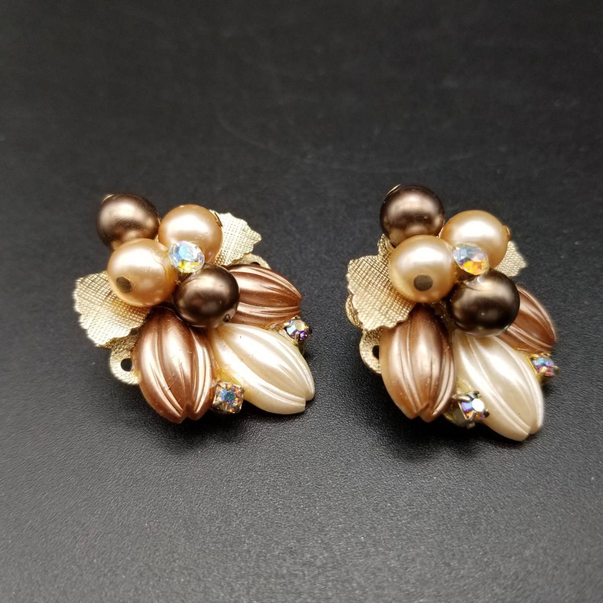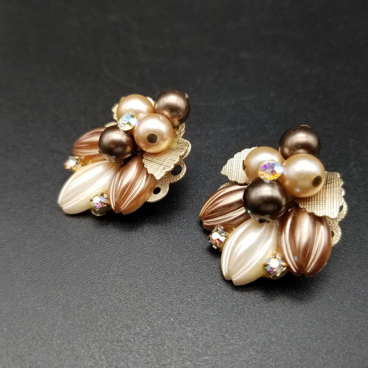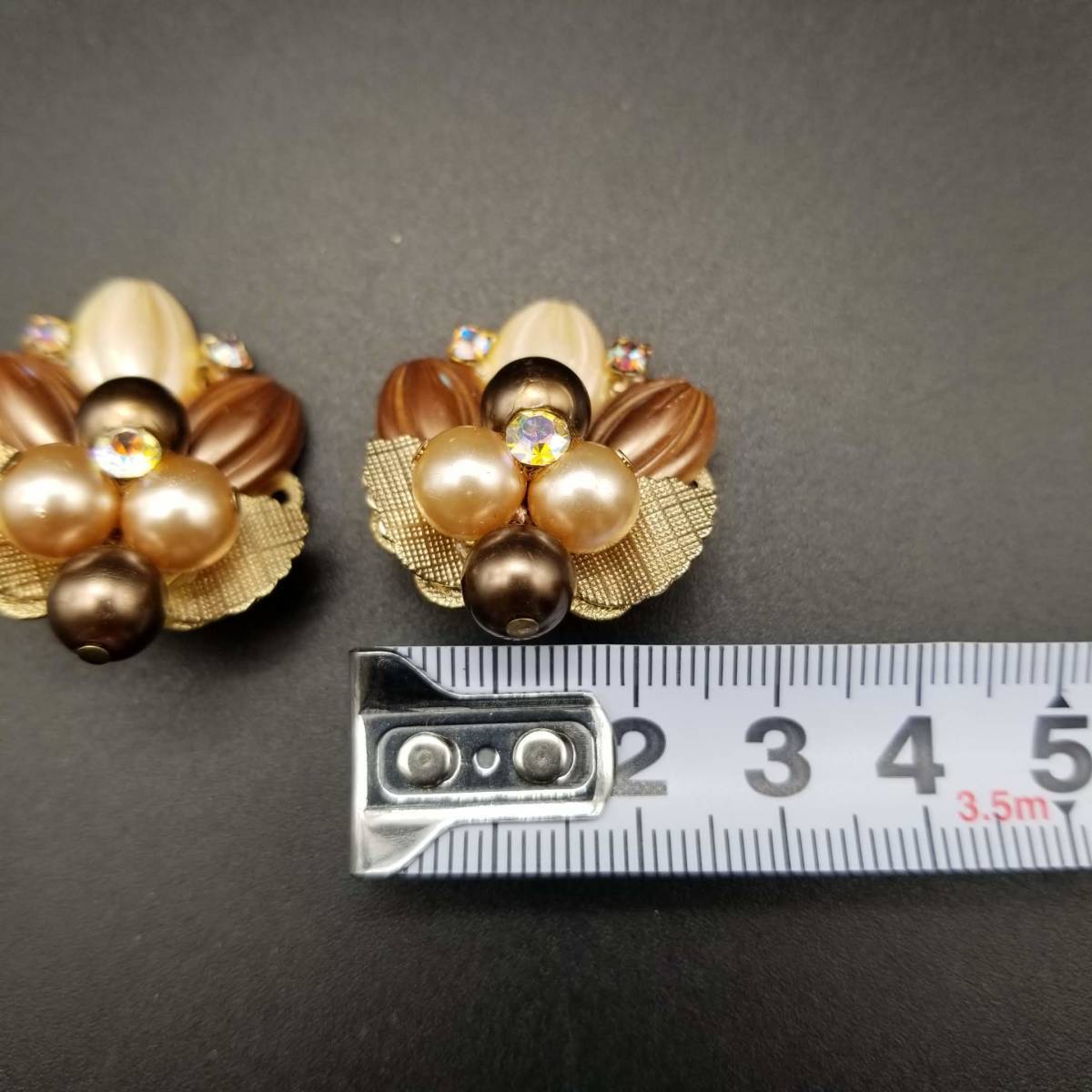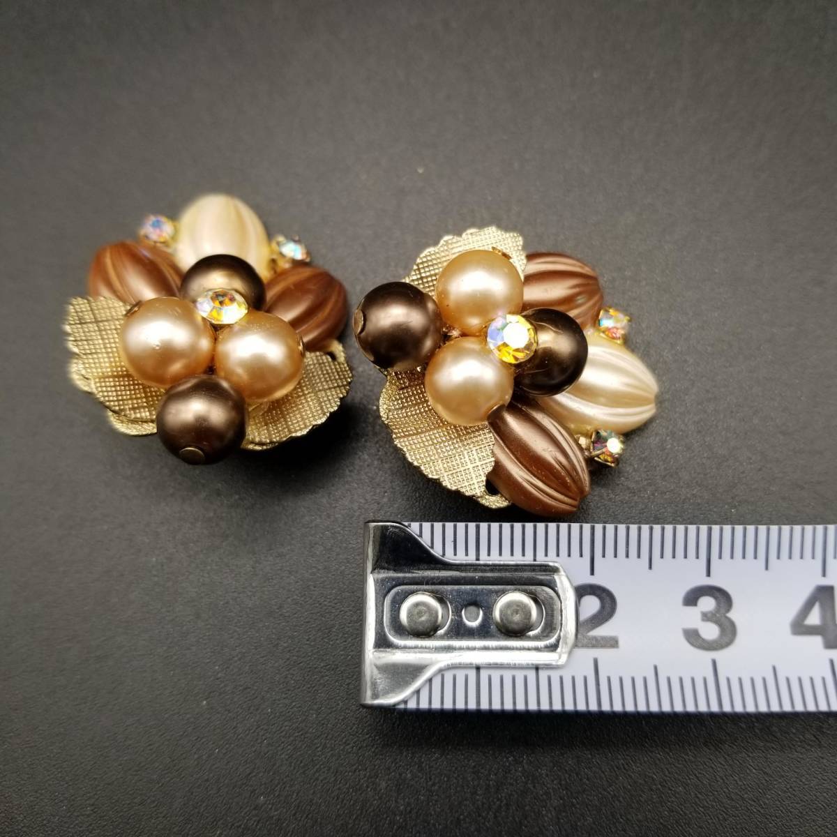 花モチーフ パール装飾 ヴィンテージ クリップイヤリング 茶系 植物 フローラル レトロキュート コスチュームジュエリー TJE4