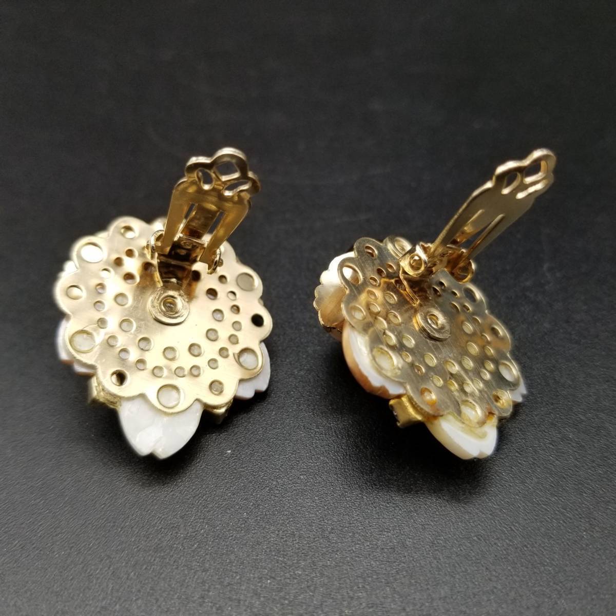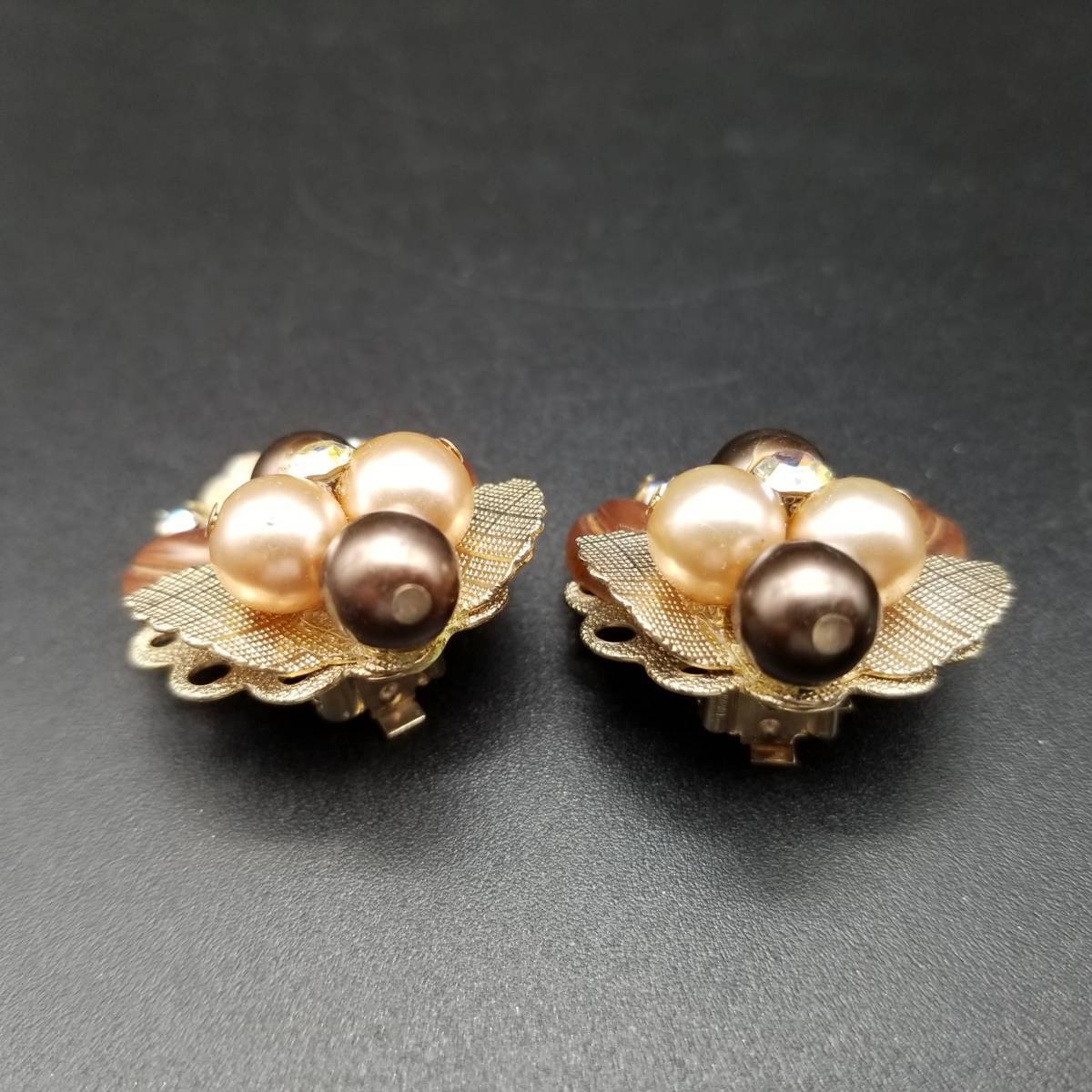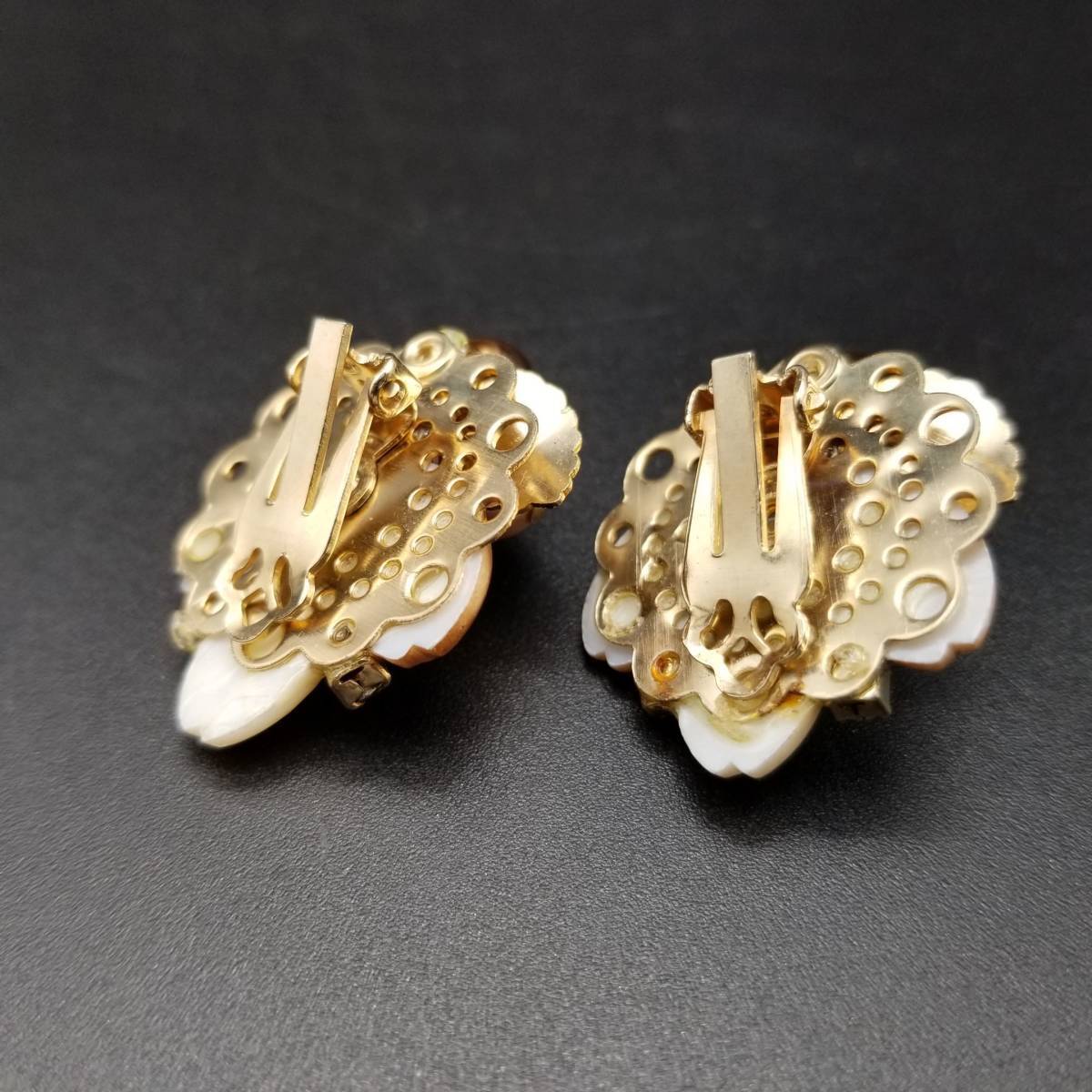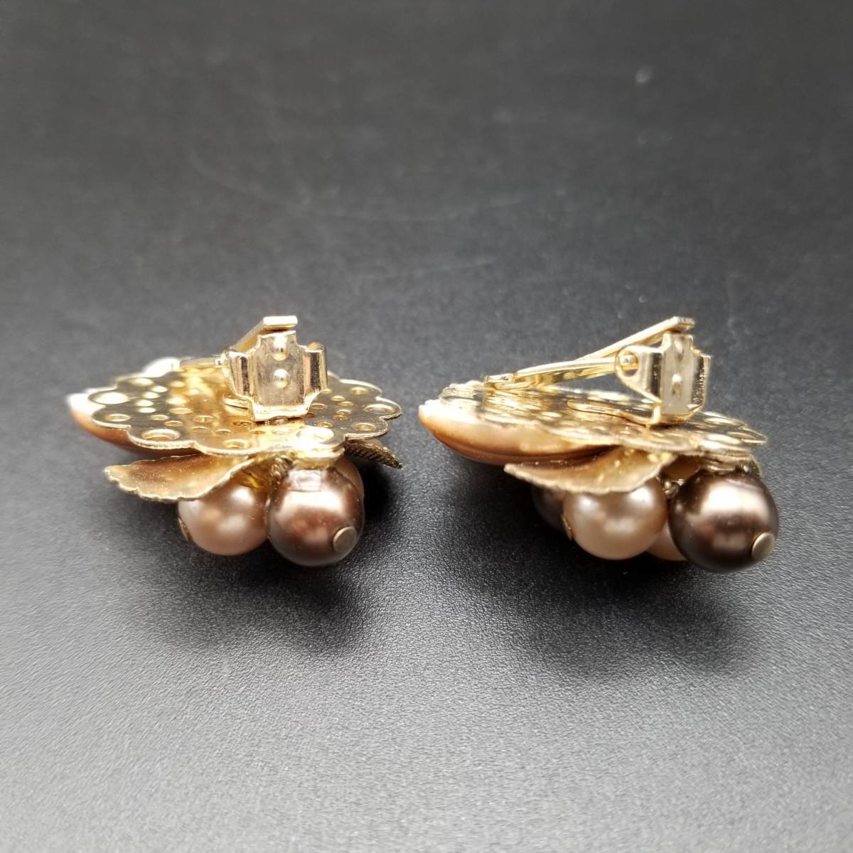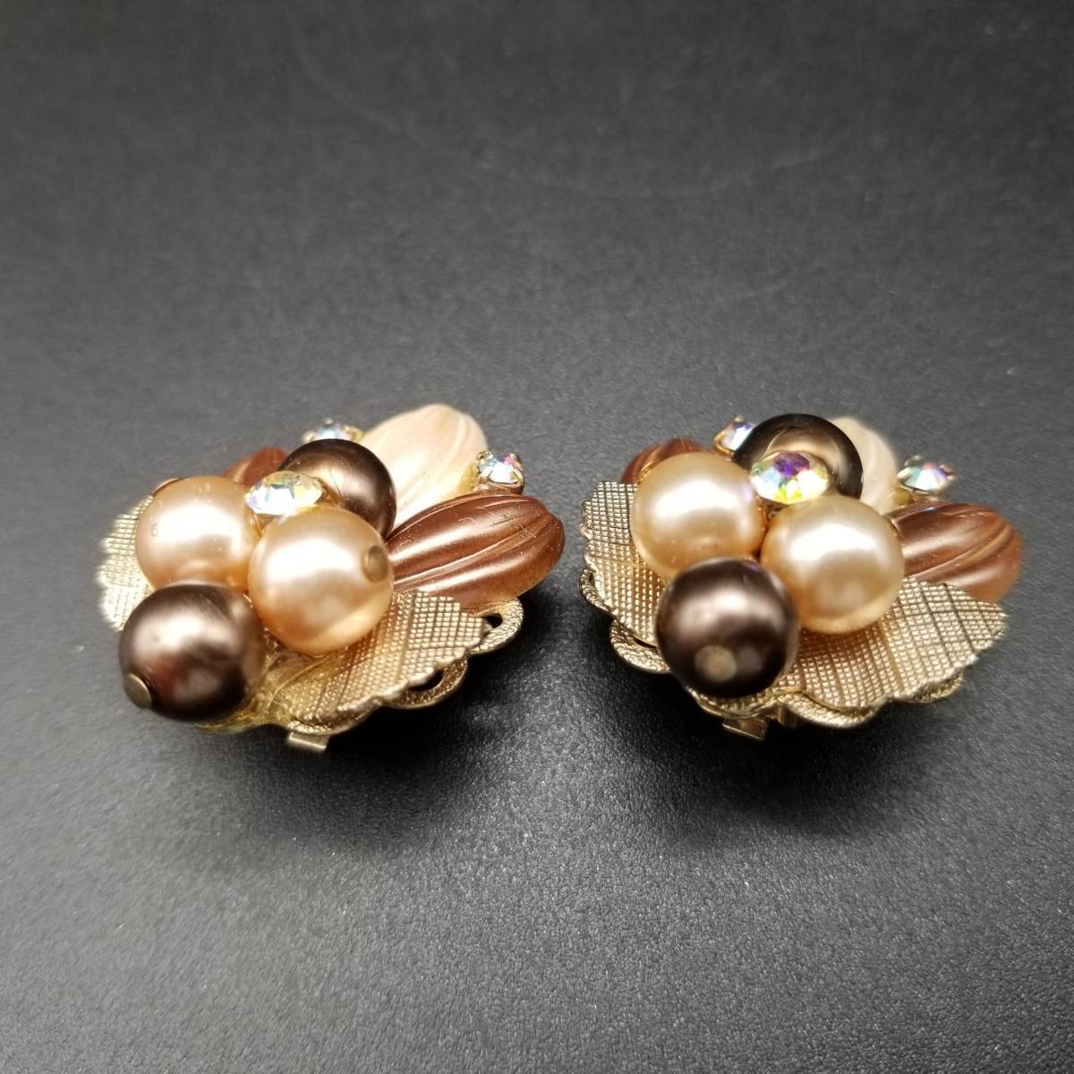 花モチーフ パール装飾 ヴィンテージ クリップイヤリング 茶系 植物 フローラル レトロキュート コスチュームジュエリー TJE4