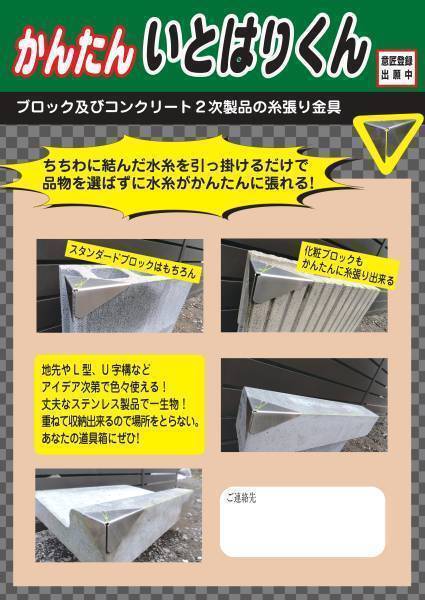 ◆ | お買い得の2セット入りです。 普通ブロックや化粧ブロックなどの水糸を簡単に張ることが出来る金具です。 ブロックに水糸を張る方法は色々ありますが、イマイチこれって言うものが無かったですよね。 考えました、すごく簡単に糸が張れます。 わずらわしい化粧ブロックの水糸張りが簡単。 驚きです、一度使ったら手放せません。 1.6ミリ厚の丈夫なステンレス製で一生物です。 ブロックの他にコンクリート二次製品やレンガなどアイデア次第で色々使えます。 4個をひと組で販売します、4個入りの価格です。 こちらで動画を紹介しています。 無駄に長いので時間のあるときにどうぞ。 領収証発行致します、取り引き連絡のメッセージに貴社の名前を入れて下さい。 土間コンクリートのスリット枠を簡単に組める「スリットくん」も出品しているので宜しくお願いします。 意匠登録済み 1591045 | ◆ | |||||||