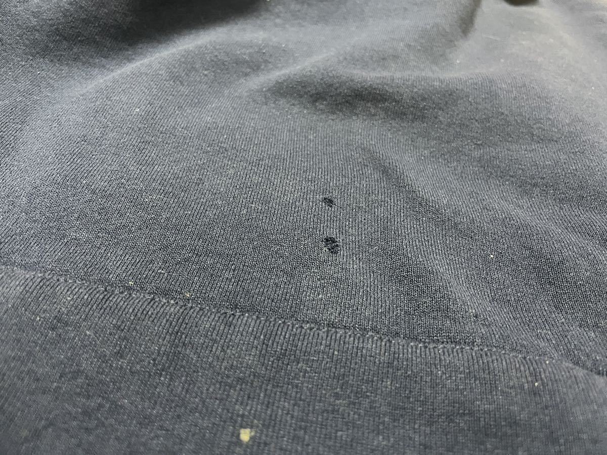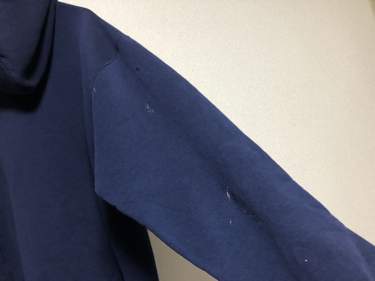ポケット上、その他小穴、 所々のペンキの付着、首元の擦り切れがあります。ポケットのステッチ外れがあります。