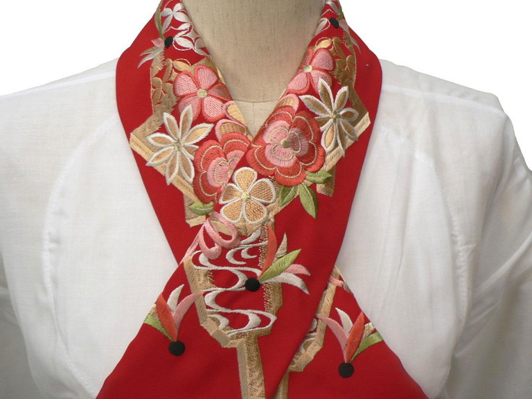 長襦袢の上にもそのままお使いいただける超便利な仕立衿。 礼装用に豪華な刺繍衿をチョイスしました。1点現品限りですのでお早めに♪ この衿は、従来のような縫い付けの手間を省き、取り外しや洗濯が楽です。 つけ方は、まず天を襦袢の中心に合わせ2つ折りにして襦袢の襟にかぶせます。 力糸を背の衣紋抜きに通し、前で結んで固定します。 |