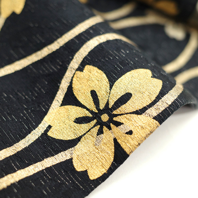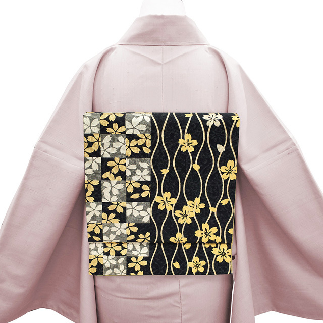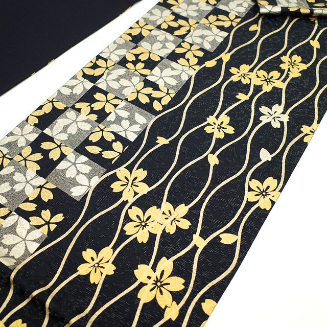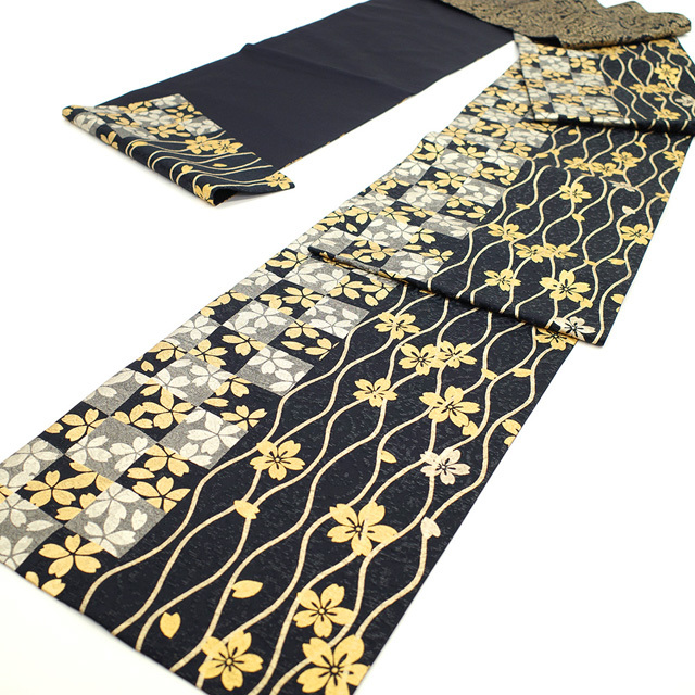 【中古】 袋帯 正絹 染め帯 金彩加工 銀通し 黒 金 桜 さくら サクラ 立涌 市松 ブラック ゴールド フォーマル ~ カジュアル 結婚式 入学式 卒業式 七五三 お茶会 普段着 お出かけ 袋帯 帯 春 販売 購入 リサイクル 美品 中古 仕立て上がり みやがわ sb52200