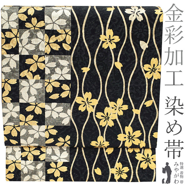 袋帯 正絹 染め帯 金彩加工 銀通し 黒 金 桜 立涌 市松 ブラック ゴールド フォーマル ~ カジュアル 中古 仕立て上がり みやがわ sb52200