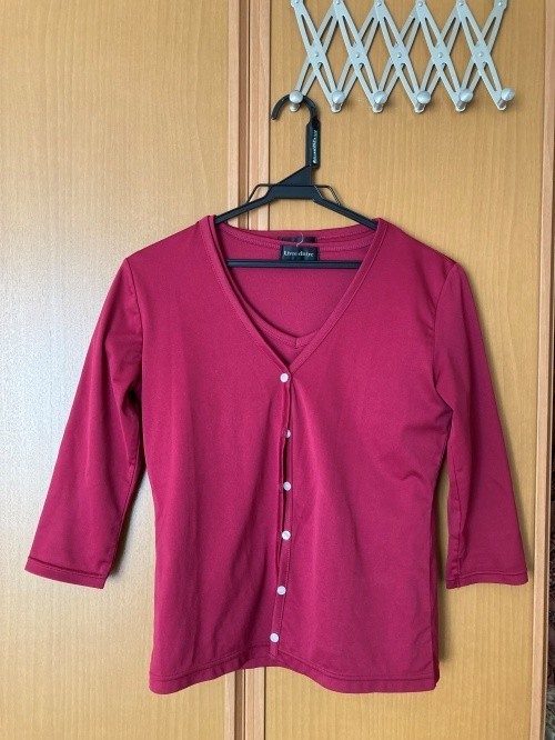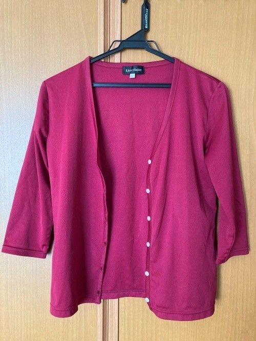 ワインレッドのカーディガンとTシャツのセットです。