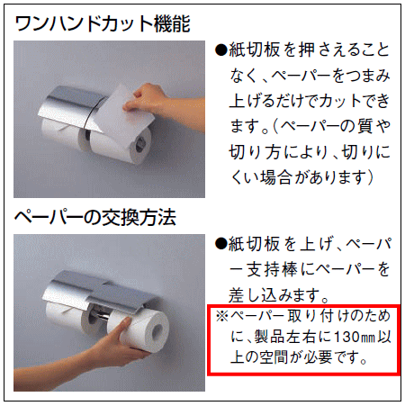 ペーパーをつまみ上げるだけでカット出来るワンハンドカット機能付