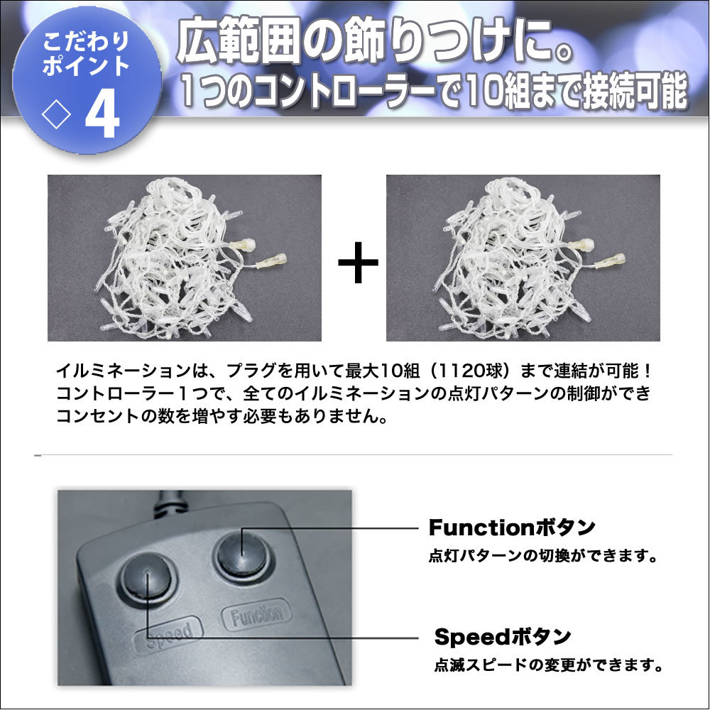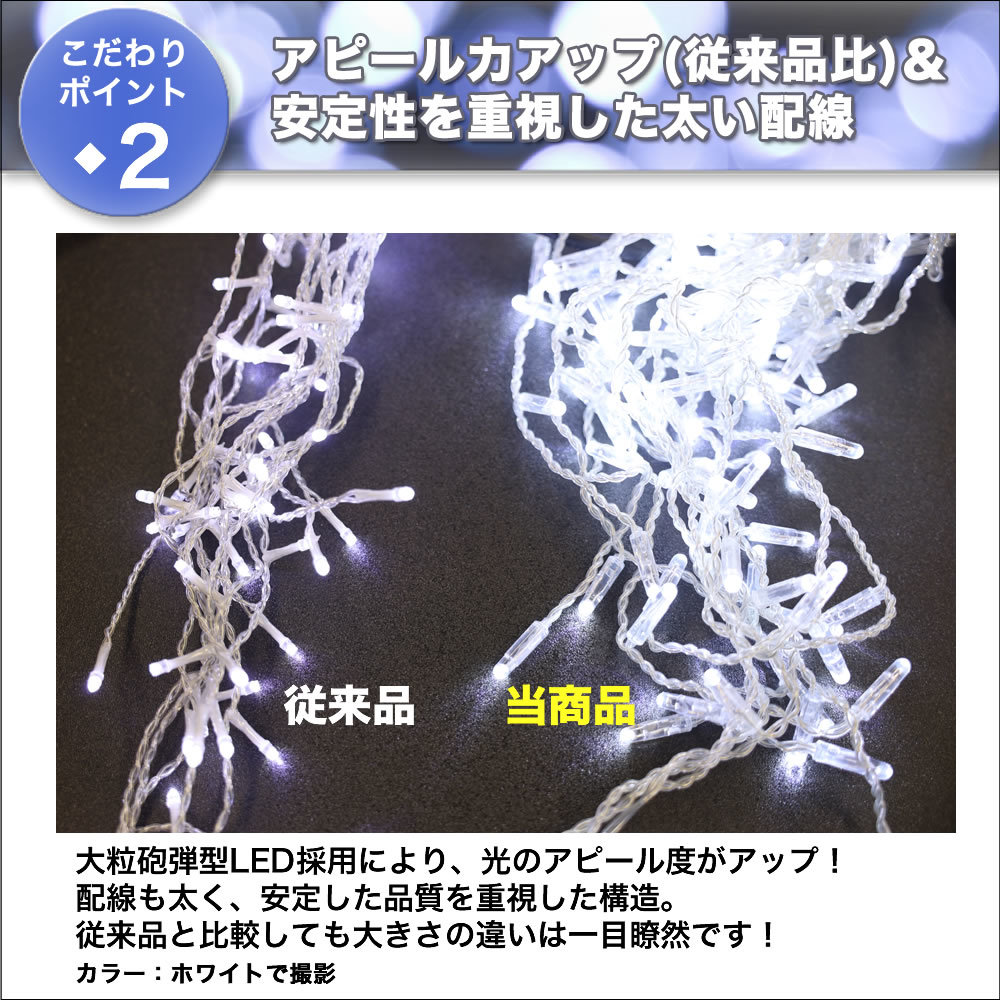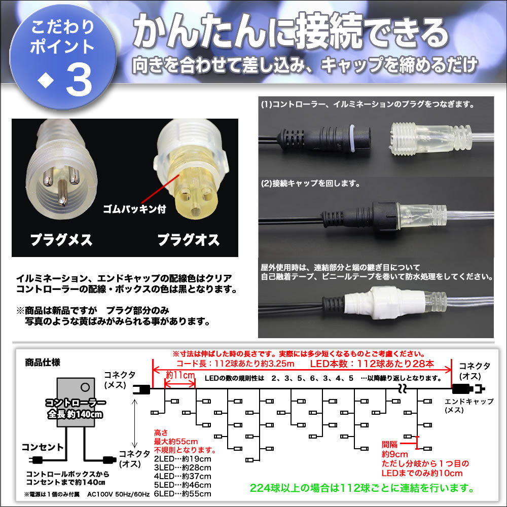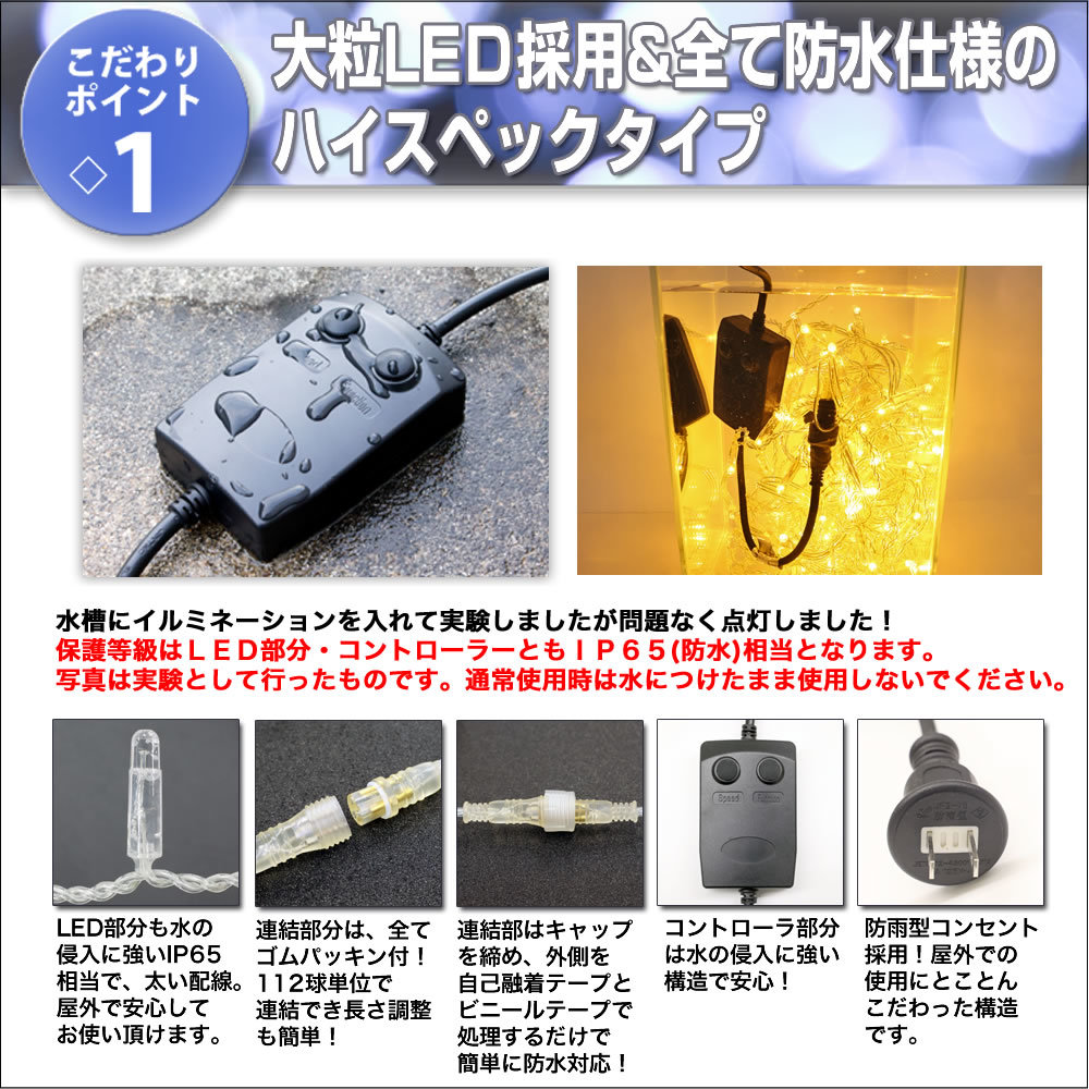 | 672球・19.5m シャンパンゴールド・電球色 点滅28種類 Bコントローラー 付 ![]() 最近は、LEDイルミネーションも各社が販売しており、 会社はもちろん、自宅等にもイルミネーションを飾り付けするケースも増えてきました。 イルミネーションで、木、庭、クリスマスツリー 等をライトアップでき、 明るく印象を変える事ができます。 最近は、価格安いイルミネーションも増えていますが、 品質面に不安を感じた事はありませんか? 「防水性能がしっかりしておらず壊れた…」 「LEDの明るさが暗い…」 「コントローラーの作りが簡素で不安」 等々で、失敗されたお客様、 品質にこだわったイルミネーションを使ってみませんか? 当社のイルミネーションは、購入してから 安心してお使い頂く為に、 とにかく品質面にこだわった商品です。 こだわりのポイントをご紹介いたします。 ![]() ![]() ![]() ![]() ![]() ![]()