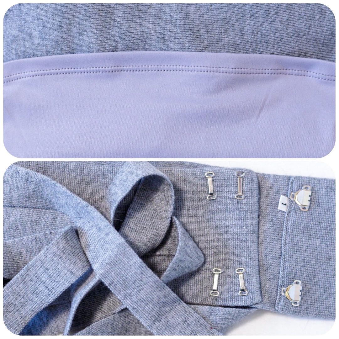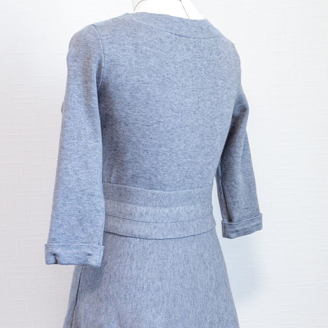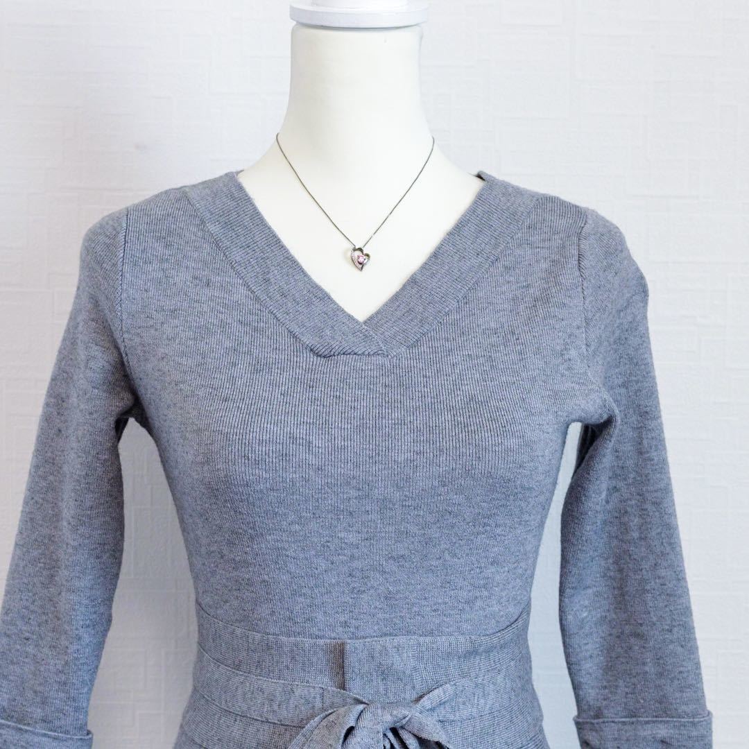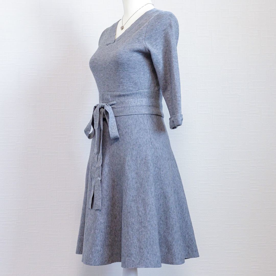 Vネック九分袖 フレアニットワンピース ひざ丈 リボンベルト付き グレー