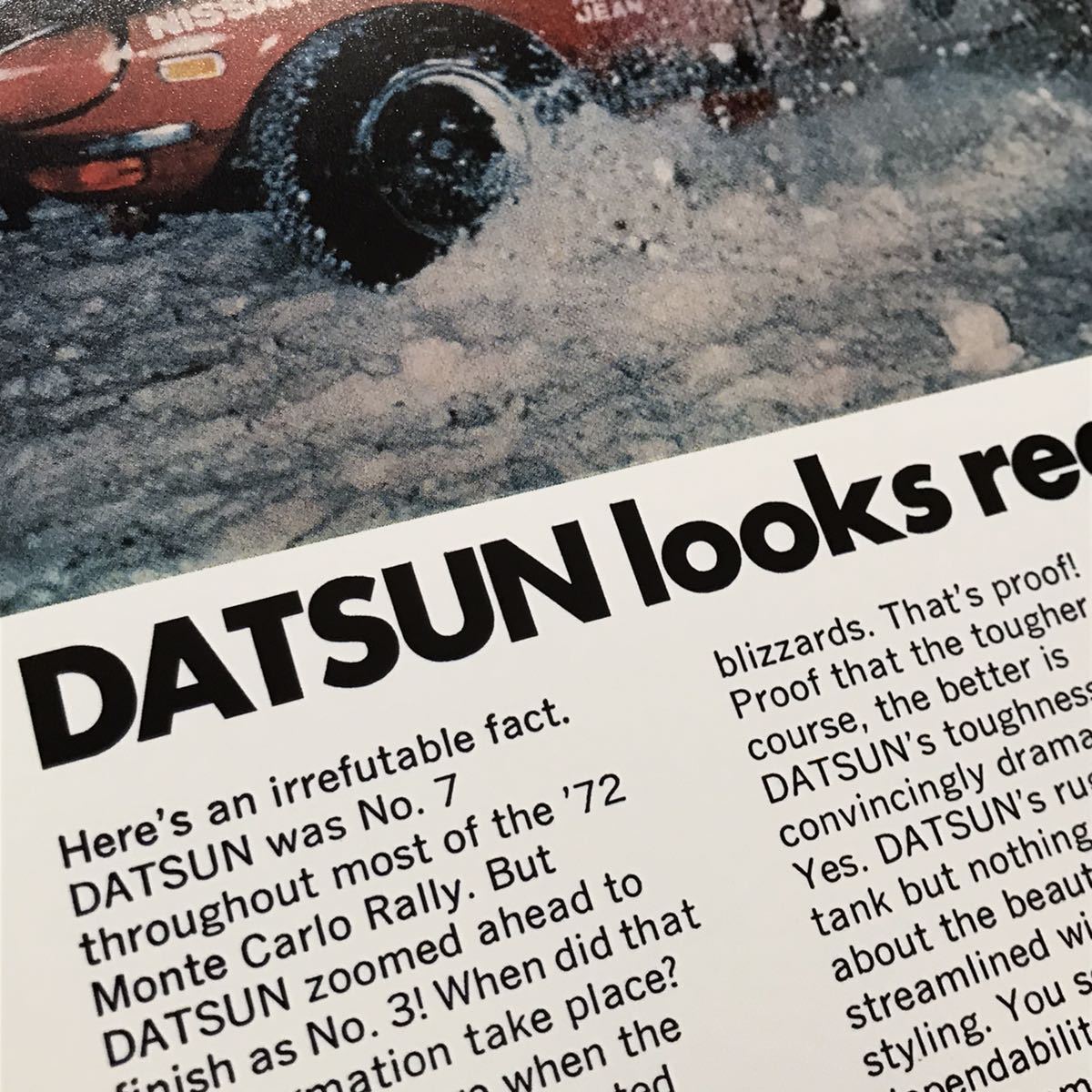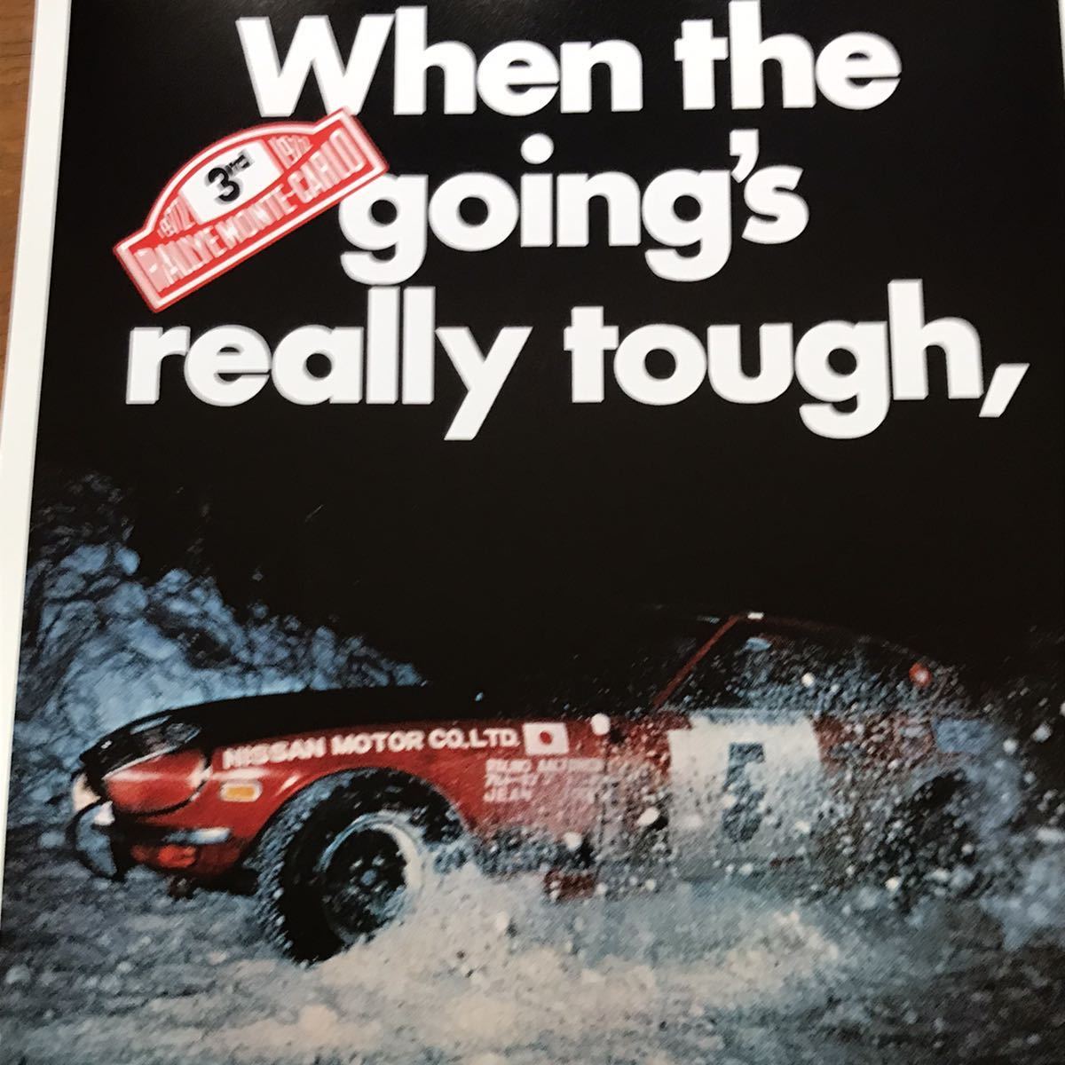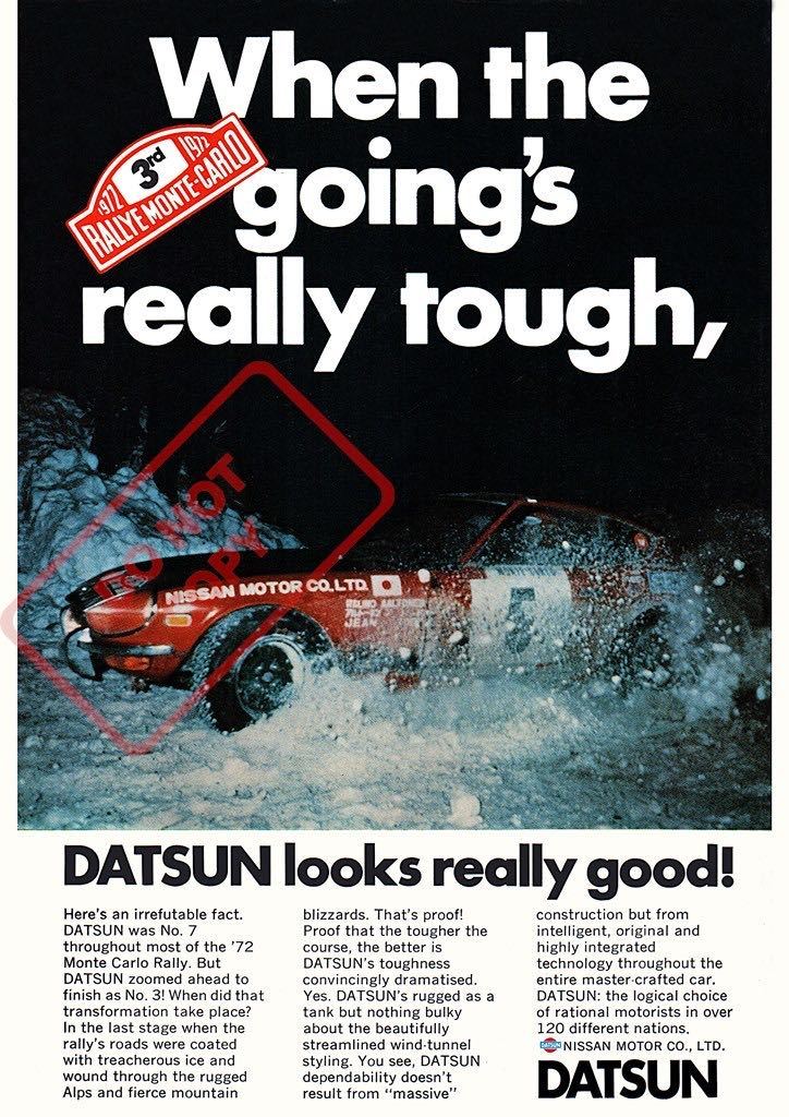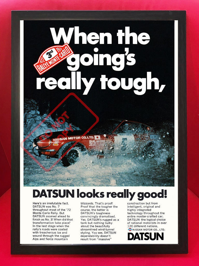 | 1972 Datsun 240Z 3rd Monte-Carlo Rally USA限定 1972年のモンテカルロラリーにて3位入賞した時のダットサン240Zの広告のリプロダクションポスターです。(ビンテージものではありません) ポスターサイズ:42cm × 29.7cm (ポスターのみの出品で額は付属しません。額はA3サイズ用がピッタリです) こちらのポスターは高品質で厚みのあるアートペーパーにプリントされた非常にクオリティの高いポスターです。カラーコピーやクラフト紙や布にプリントされたような画質の粗いポスターではありません。また、存在感があり、しかも飾るのにも困らない絶妙なサイズですので、お好みのフレームに入れディスプレイするのに最適です。またしっかりとした厚みのあるポスターですので、そのまま無造作に壁などにピンでとめるディスプレイのスタイルもおススメです。趣味の部屋・ガレージ・カフェ・ショップ・Bar・オフィスなどに! ※60's・70's・80'sを中心にマニアックな映画・旧車・バイク・音楽バンド関連などの様々なポスターを多数出品中ですのでチェックしてみてください! Click→映画関係ポスター Click→音楽関係ポスター Click→自動車関連ポスターA Click→自動車関連ポスターB Click→オートバイ関連ポスター Click→その他ポスター | ||