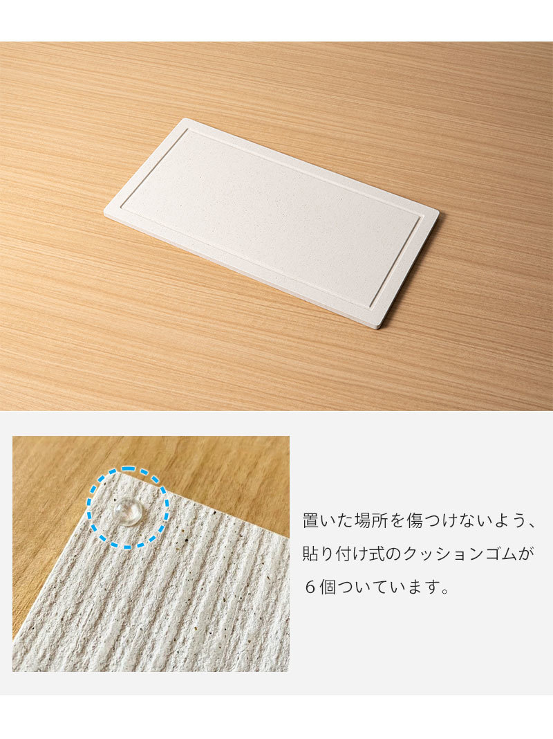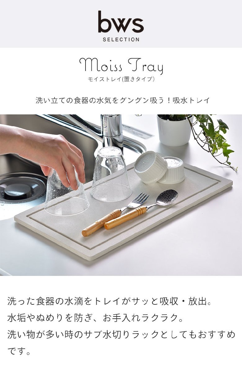 | KAWAKIシリーズの水切りラック置きタイプ専用の交換モイストレイですが、トレイ単品だけでも使用できます。 シンク横などに置いて洗った物をのせるだけで乾かせます。 洗い物から落ちた水滴を吸収し、徐々に空気中に放出してくれる日本製の吸収トレイ。 水捨ての手間や、水垢の心配もなくお手入れ簡単です。 吸水力が弱ったと感じたら、風通しの良い場所で陰干しをしてください、汚れがついた場合は付属の紙ヤスリでこすってください。 置いた場所を傷つけないように貼付け式のクッションが付いてます。 【モイスとは】 吸水素材モイスは、天然素材を主成分とするインテリア建材です。 バーミキュライトや珪砂を主成分とした、天然鉱物から作られる日本製の建材です。 珪藻土同様、水分を吸収し吐き出す性質から、近年バスマットや水切りプレートとしても人気の素材です。 吸水が早く、表面の手触りがサラっとしているのも特徴です。 |
