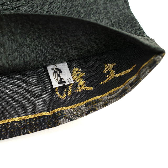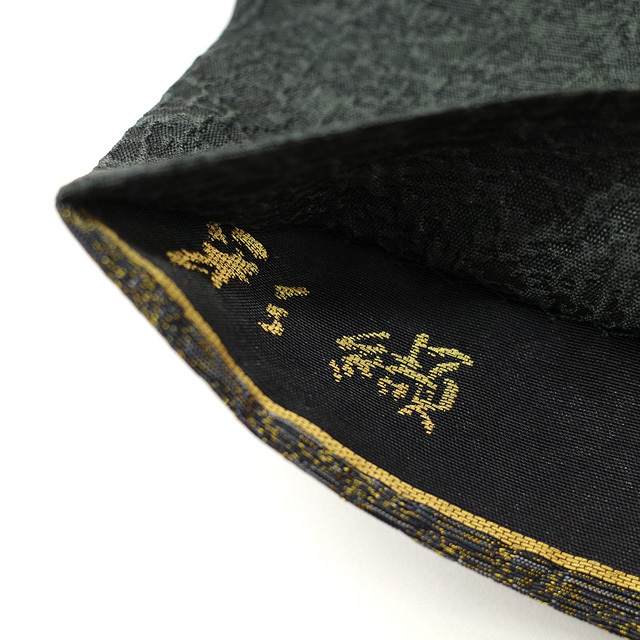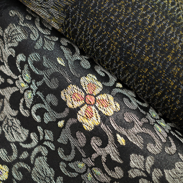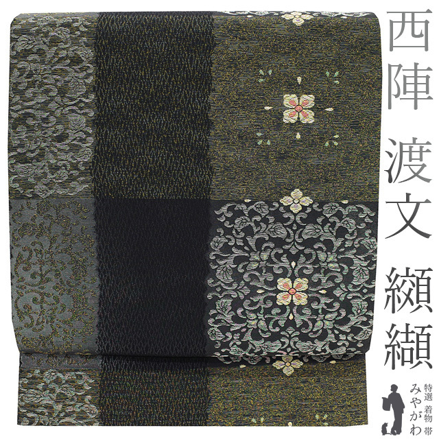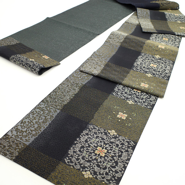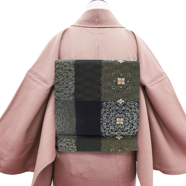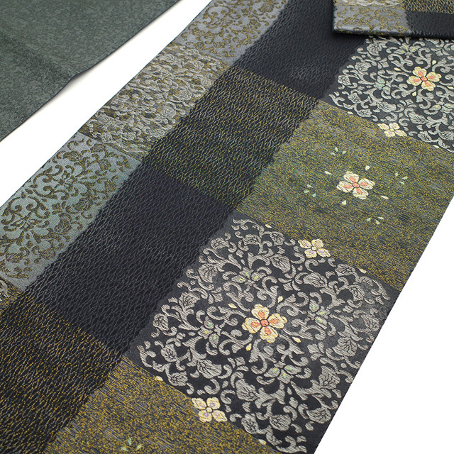 こちらのお品は、黒地にシルバーグレーの引箔や金糸の格子に花唐草が織り上げられています。
