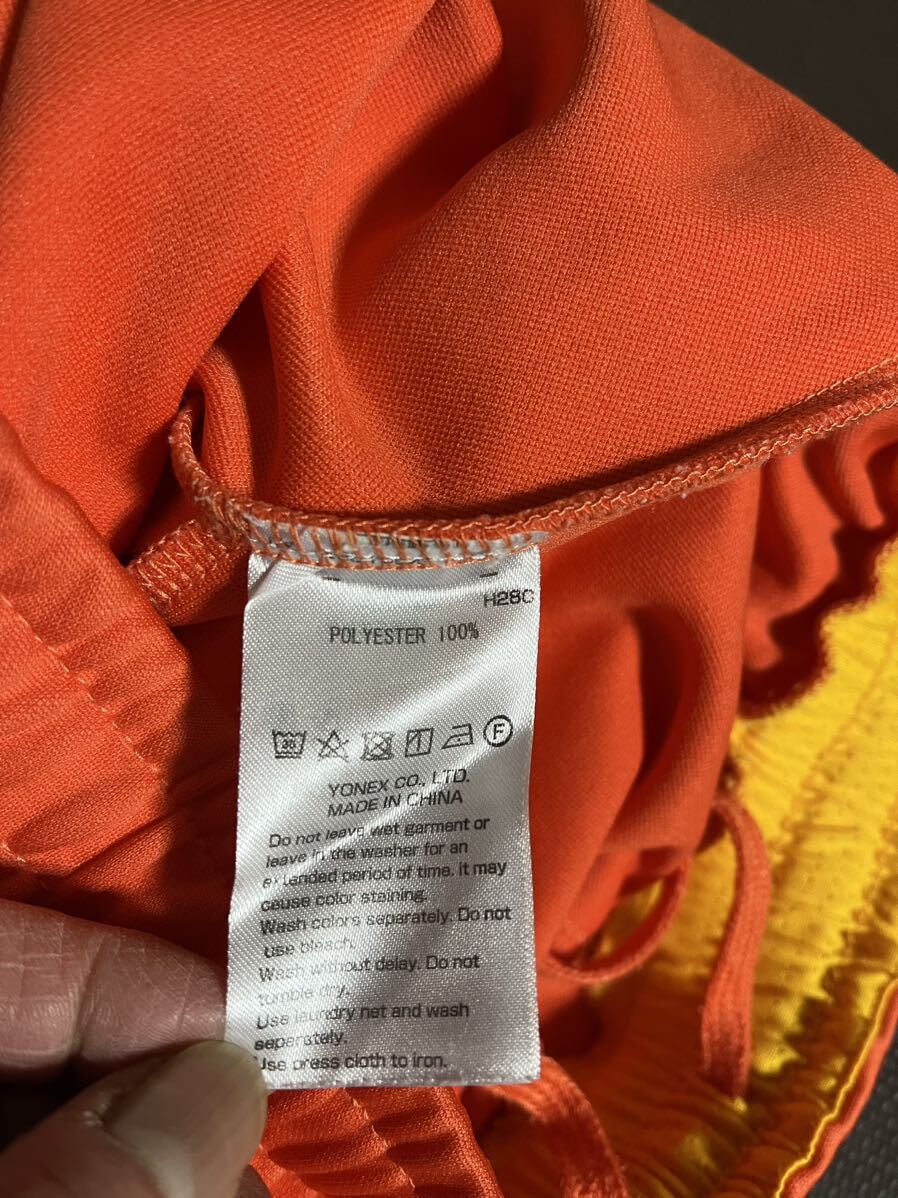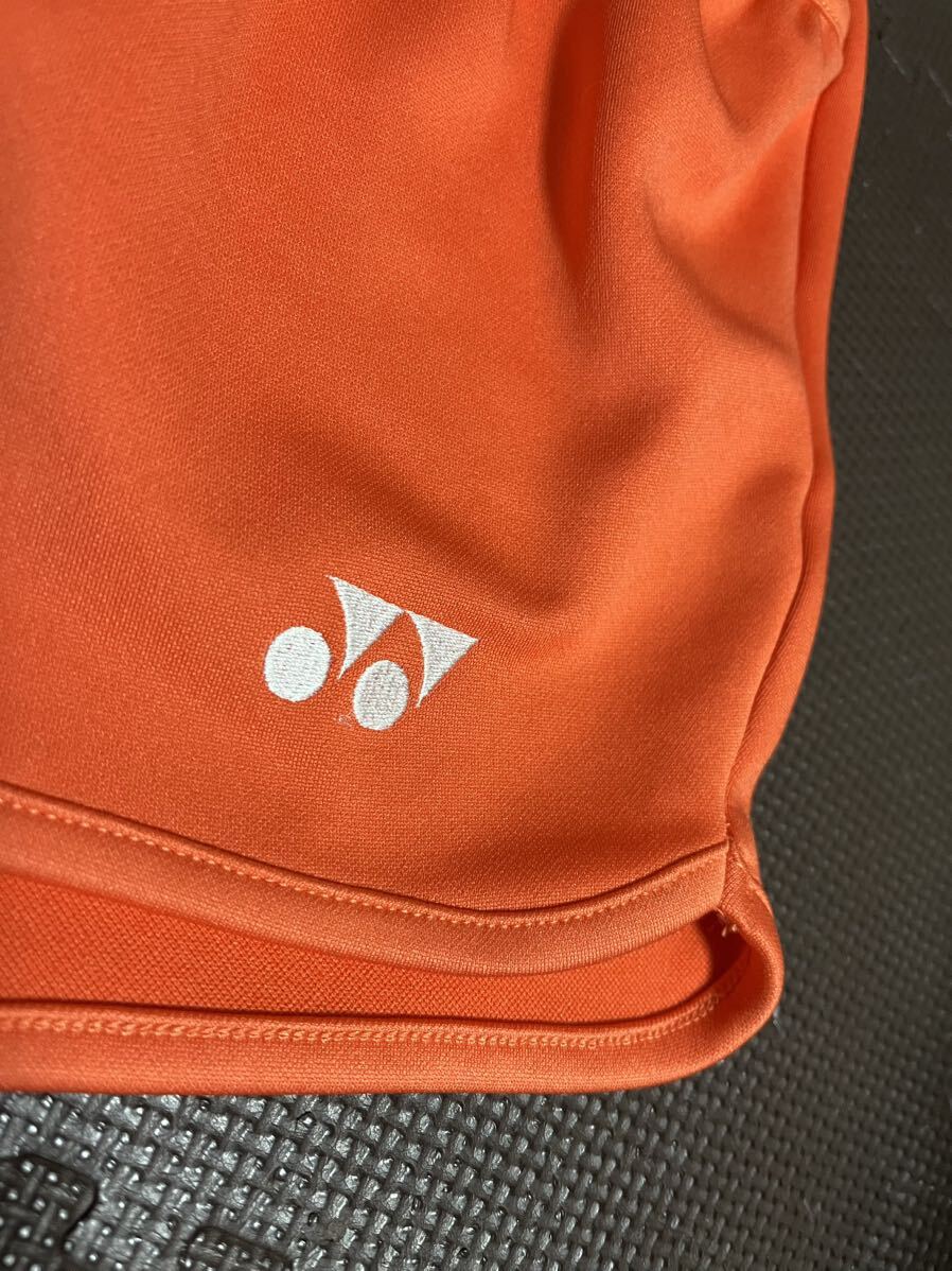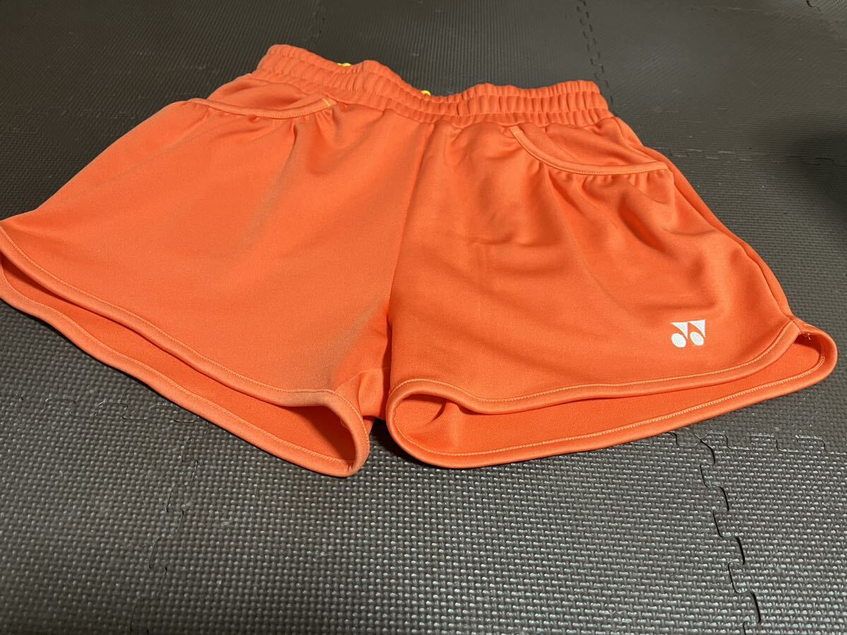 美品YONEXオレンジ、ロゴ白(刺繍)ストレッチハーフパンツ