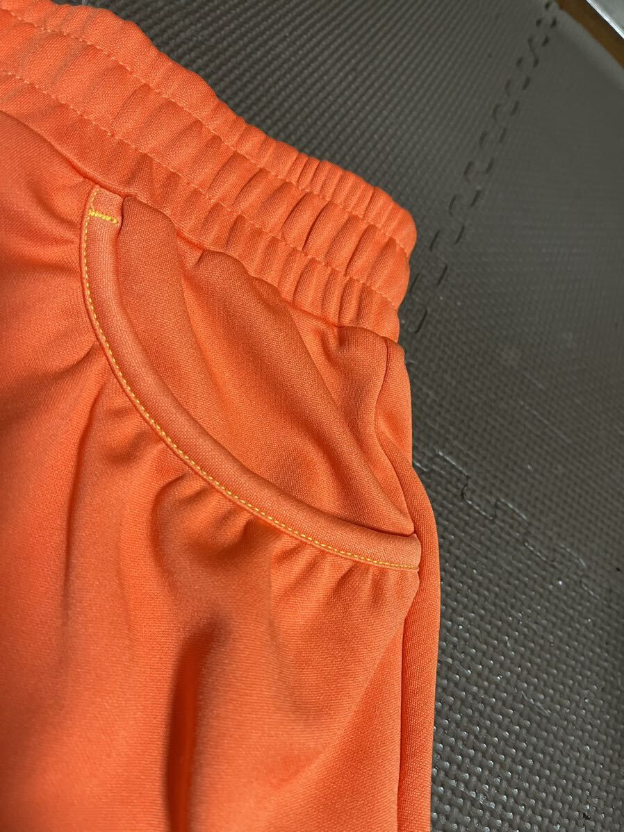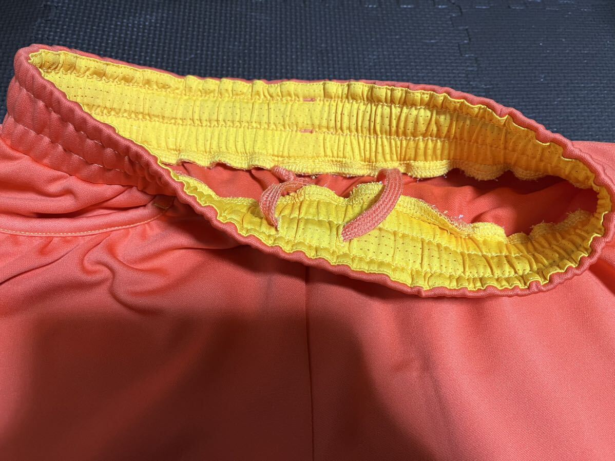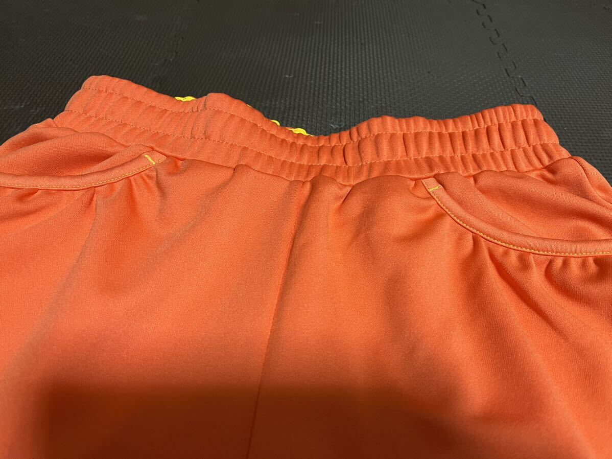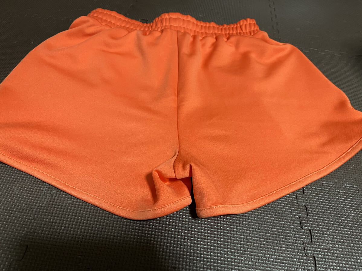 美品YONEXオレンジ、ロゴ白(刺繍)ストレッチハーフパンツ