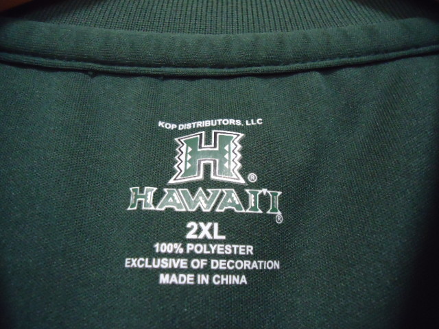 ハワイにて、個人の方より、購入しました。新品未使用品(紙タグ付き)。ハワイ大学社製。中国製。左胸、ロゴ刺繍です。ポリエステル100%素材なので、伸縮性あります。カラーは、濃緑色です。サイズ表示は、XXLですが、平置き実寸を重視して下さい。なお、少々誤差は、ご了承下さい。肩幅約58センチ・身幅(脇の下)約68センチ・丈約84センチです。新品未使用品ですが、個人売買商品ですので、一度クリーニング後の着用、お勧め致します。24時間以内に、お手続き入力後、期限内にかんたん決済、出来る方のみ、ご入札をお願い致します。この商品は、1点物です。 ※※発送方法・送料は、レターパックライト郵便(追跡可能・補償無し)ですと、430円又は、レターパックプラス郵便(追跡可能・手渡し配達・補償無し)ですと、600円です。※※ ☆★★★★★☆送料は、変わりますが、何点でも、同梱包可能です。数点落札されましたら、まとめて取引を、選択お願いします。☆★★★★★☆