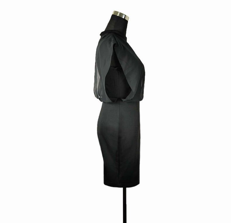 収縮性あり、透け感ややあり、スカート部分に裏地あり、光沢のあるしっかりとした生地質、後ろ裾中心にスリットあり、バックファスナーあります。