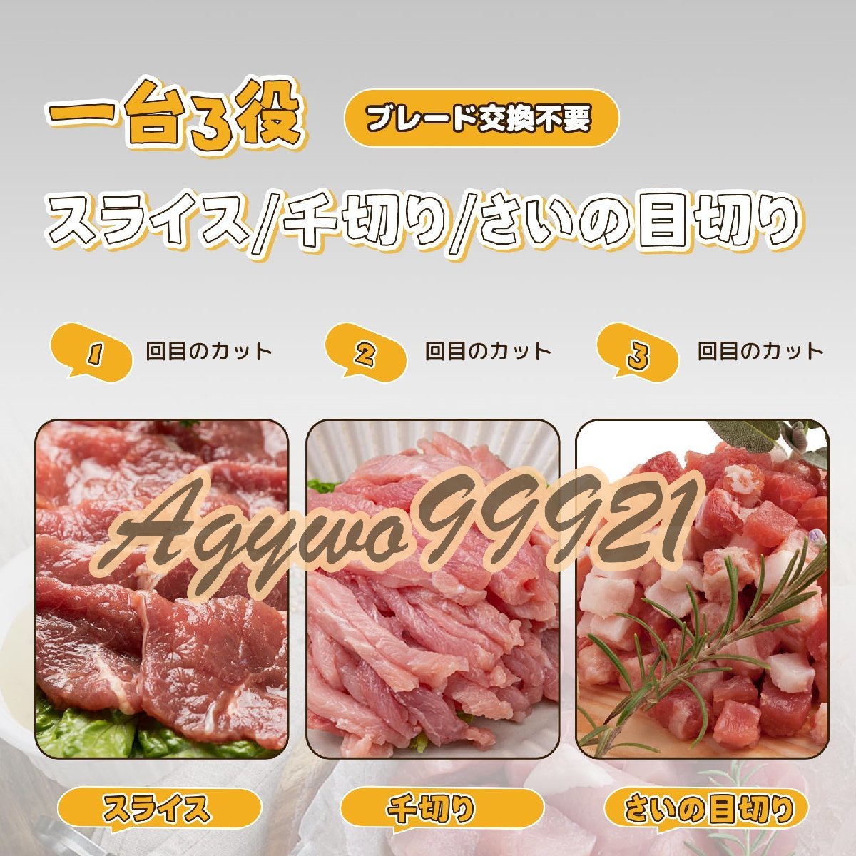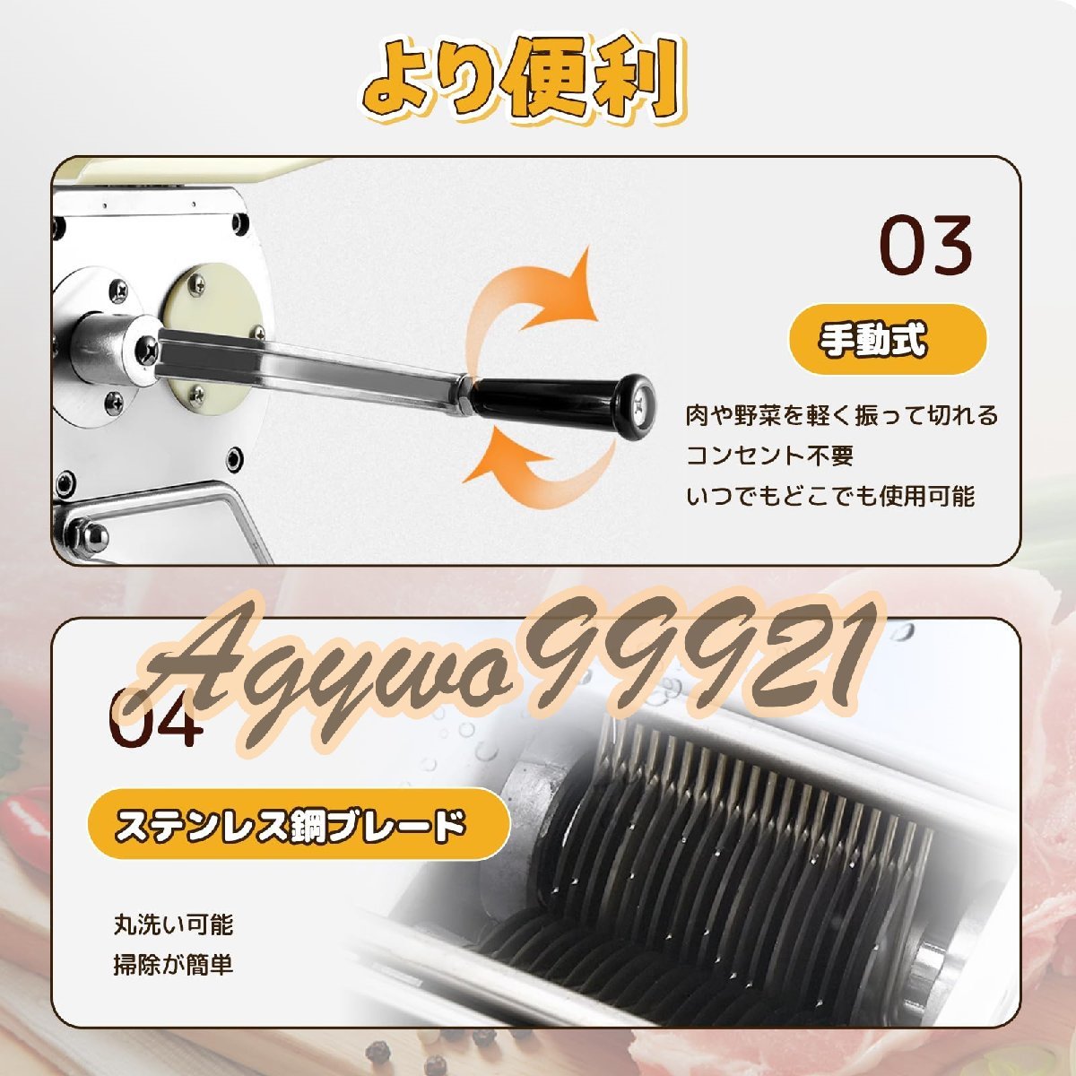 【キッチンのヘルパー】60kg/hのスライス量!家庭用の場合、10分かけてやるべきことを1分でできるようにします。肉のカットも簡単にできるし、複数のスライスオプションでメニューが広がります。業務用の場合、効率性を向上させるし、均一な厚みで標準化を実現します。