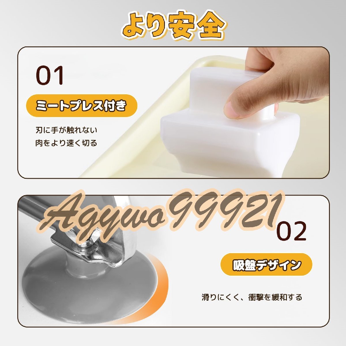 【より安全】刃物への直接接触を避けるための内蔵ブレードとミートプレス、より安全だし、肉をより速く切れます。吸盤デザイン、滑りにくく、衝撃を緩和します。