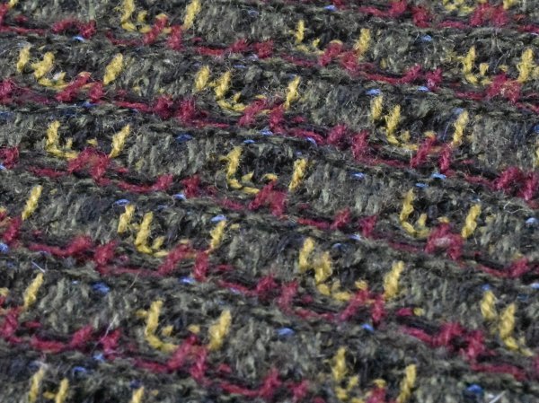 襟付きのセーターで、深緑を基調に色々な色の糸が編み込まれています。
