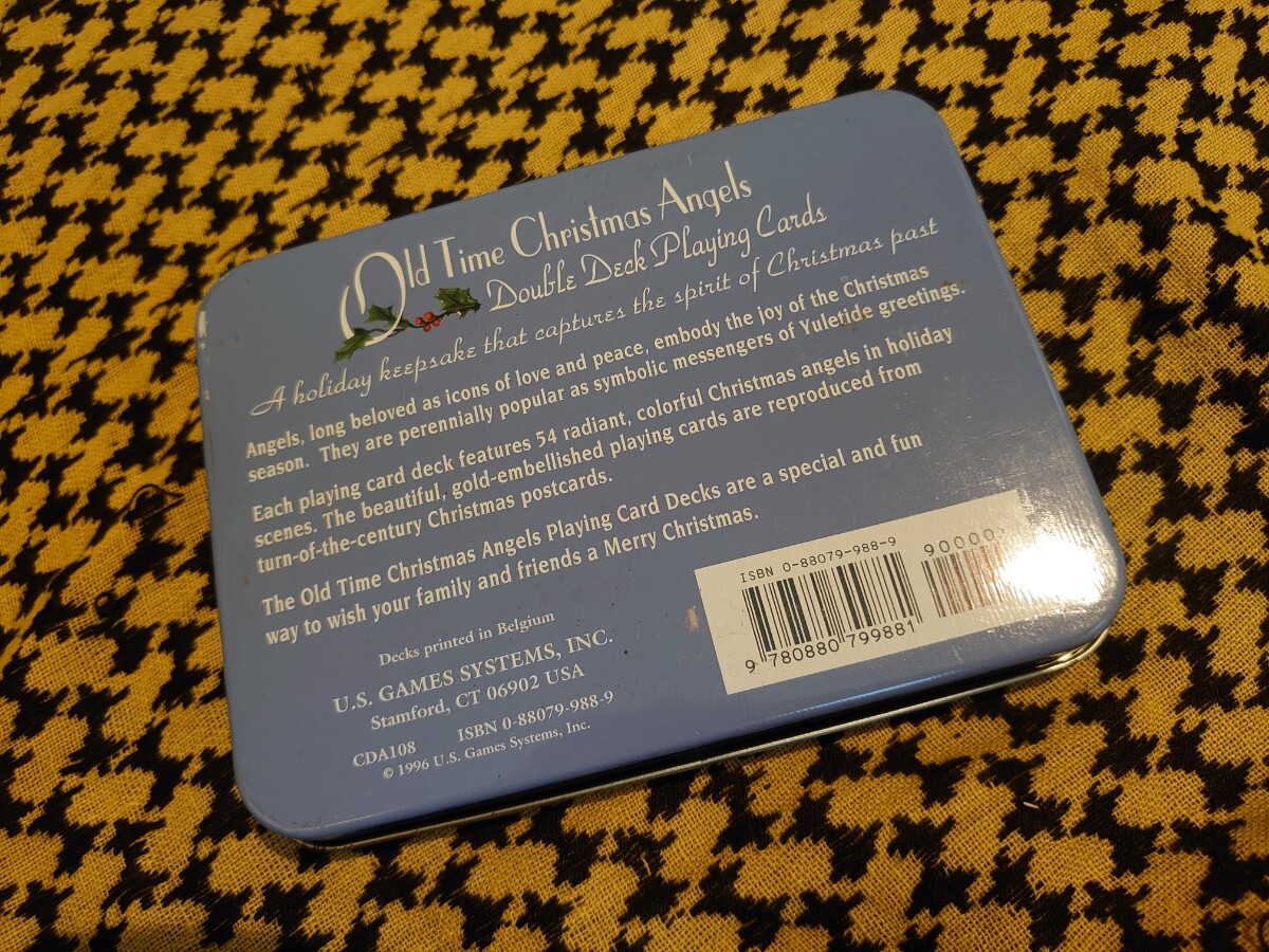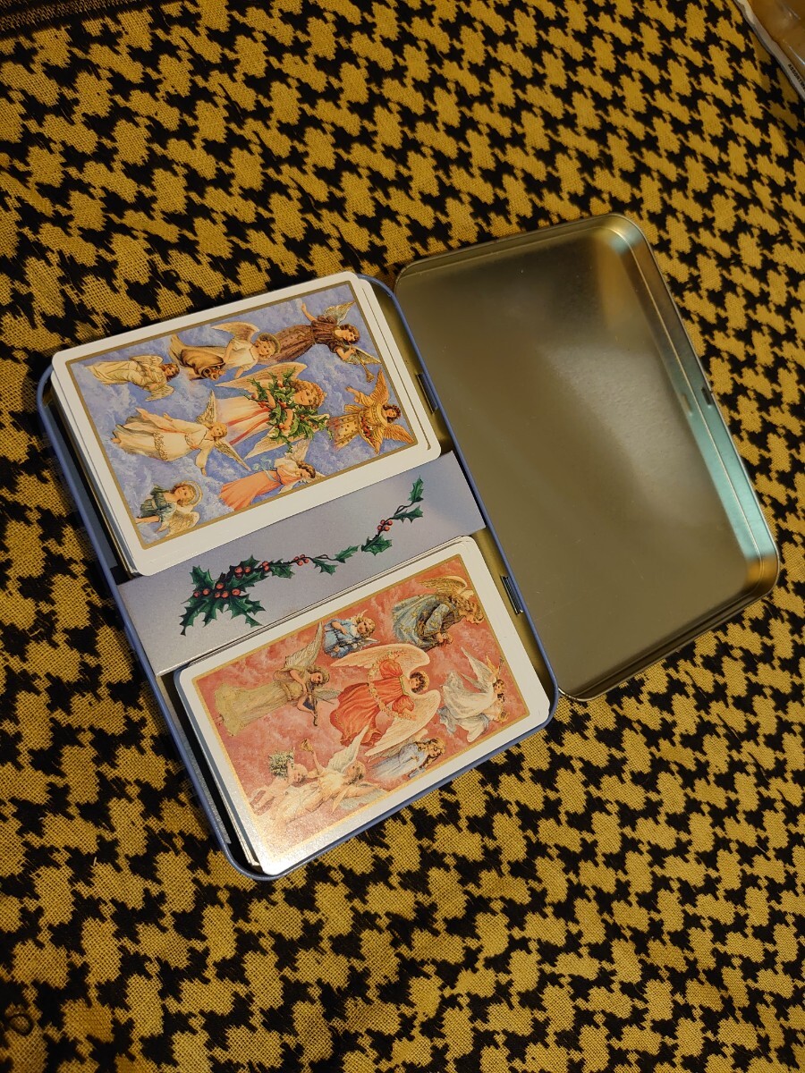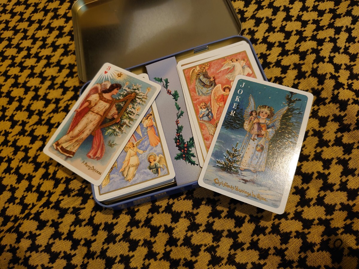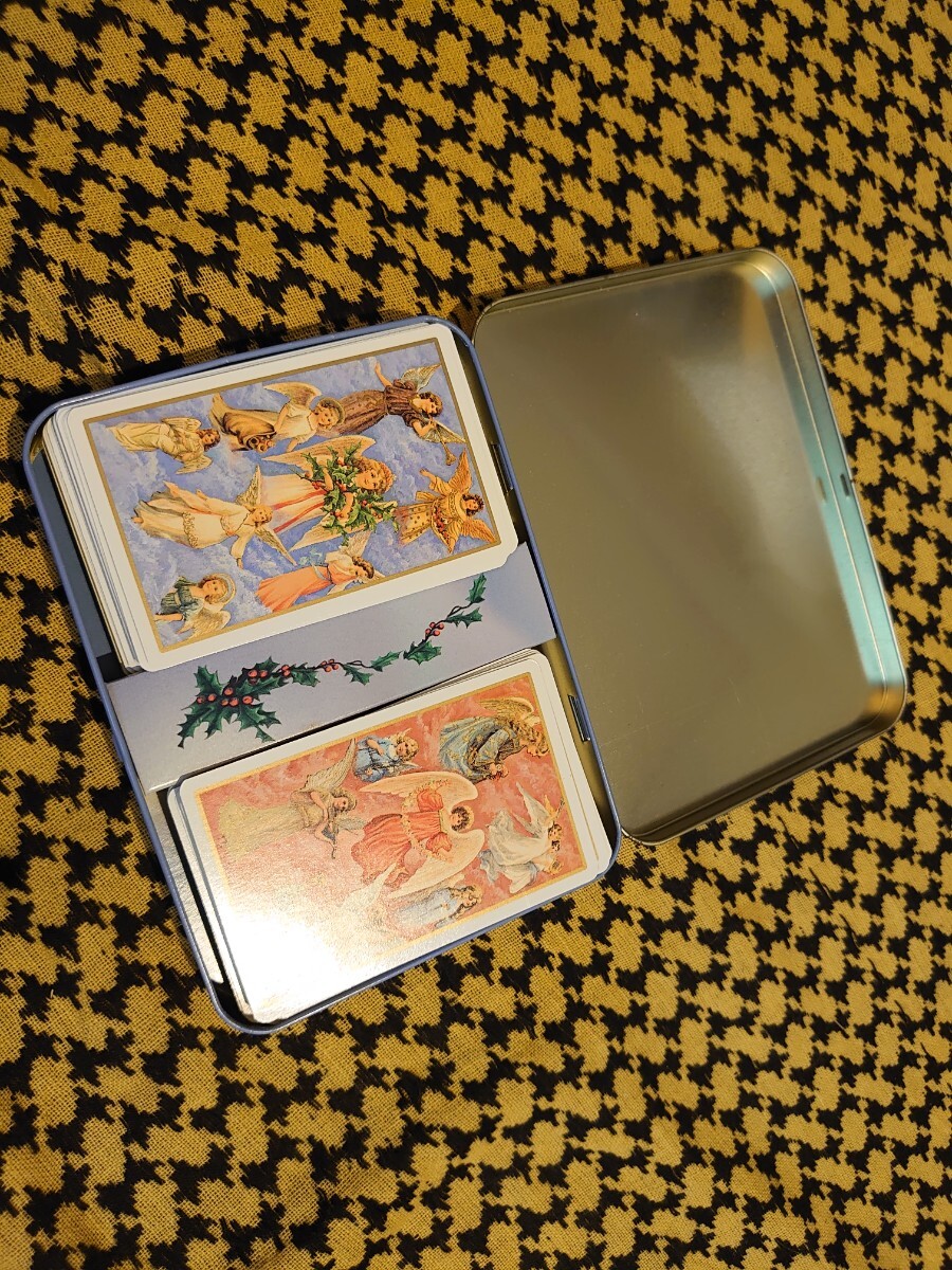 54の異なるエンジェルズの絵柄のベルギーのエンジェルトランプです。それが左右に1セットずつ入っているようです。よく見ても細部まで問題はないようですがアンティーク・ビンテージなど古いものは特に一見して分からない問題がある場合もございます。未使用ですが缶などはやや傷んだり、汚れたりしている場合もございます。苦情返品なしでお願いいたします。ゆうパックにて発送、運送中事故についての保証は運送会社の条件範囲内のみになります。